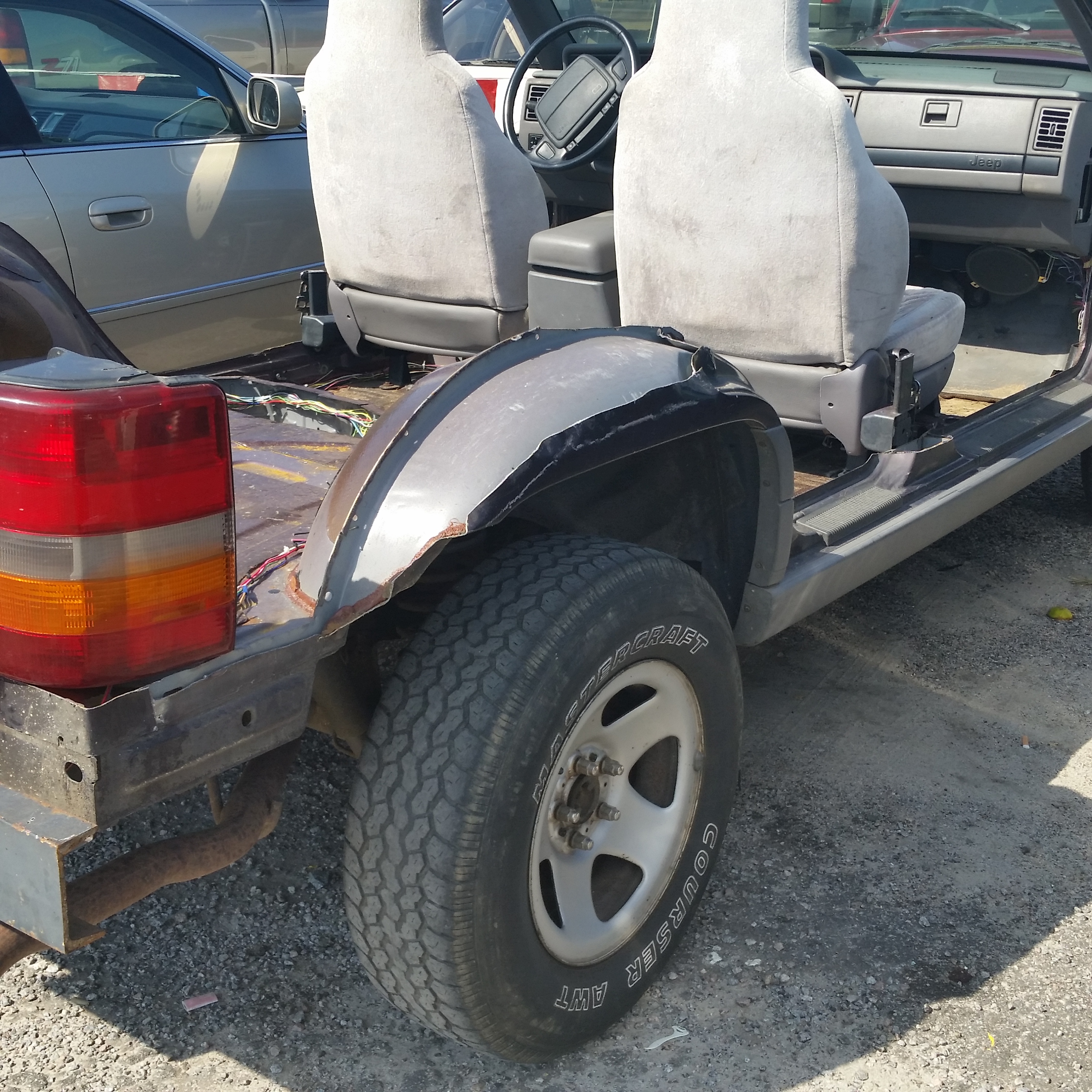 The weekend before last I went to one of the local flea markets near my home. Trips to the flea markets have NEVER failed to amaze me at the stuff you see there. This trip was no exception, in fact, it went to a new level of weirdness. This Jeep Cherokee has been stripped down to the floor pan, the front clip, the front seats, and the rear taillights. Nothing else was spared! I apologize for the bad pic, I was up kind of close and didn't take a few steps back to capture the total awesomeness of this unique street cruiser. :shocked: Notice the speaker under the dash,got to have some tunes while cruising in this bad boy.