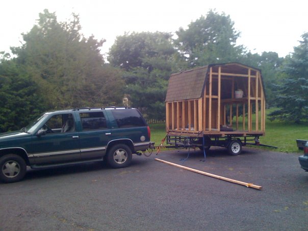 Step 2. Take shed over to the driveway and use an Impala SS to pull the shed up onto the rails of the trailer.