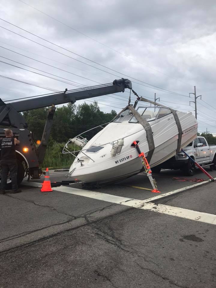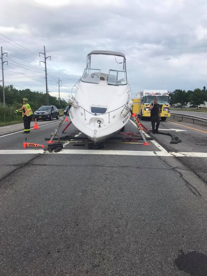 Sorry I am late to the party but I have been on vacation. A relative of mine knows a relative of the driver. He thought the truck in front was going to run the yellow light and he was going to follow. When the front truck decided to stop he had to make a panic stop. He also claims the boat was strapped down and that the straps broke. I didn't see any broken straps in the pics.