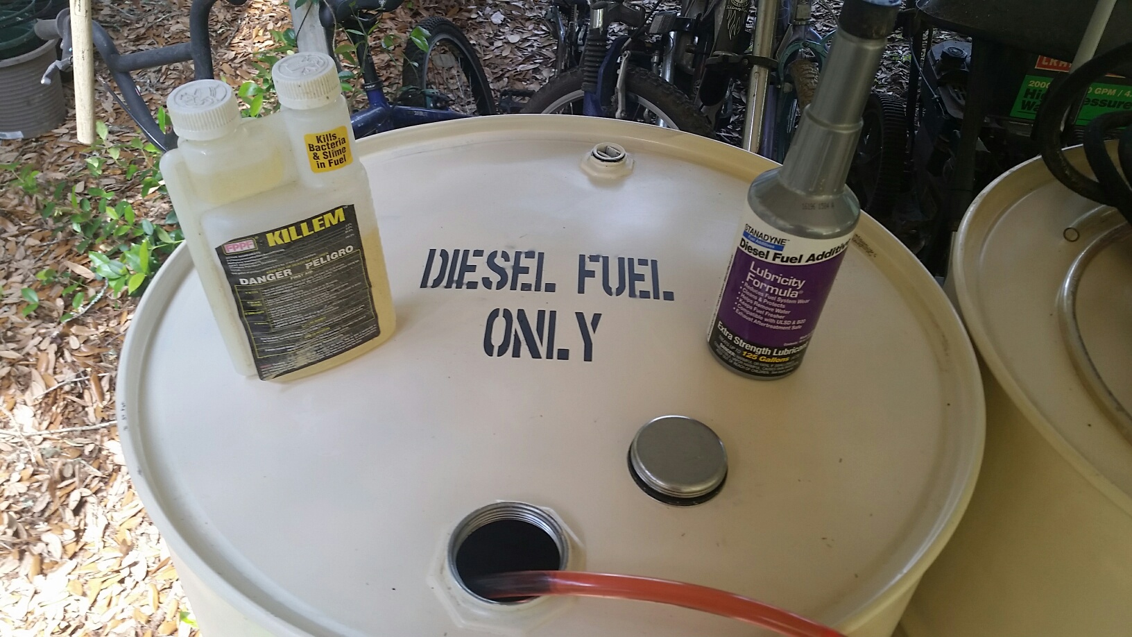 The plan on these is to purchase 100 gallons of off road diesel to have on hand and use. I purchased a military surplus diesel generator that is equipped with an auxiliary fuel supply system. It has a bung adapter and pickup tube that fits the large hole in the drums. A secondary fuel pump and float switch senses when the tank drops below a certain level and pumps fuel from the drum to the generator tank. I figure I will use fuel from the drums in my tractor and backhoe to keep it rotated and fresh.