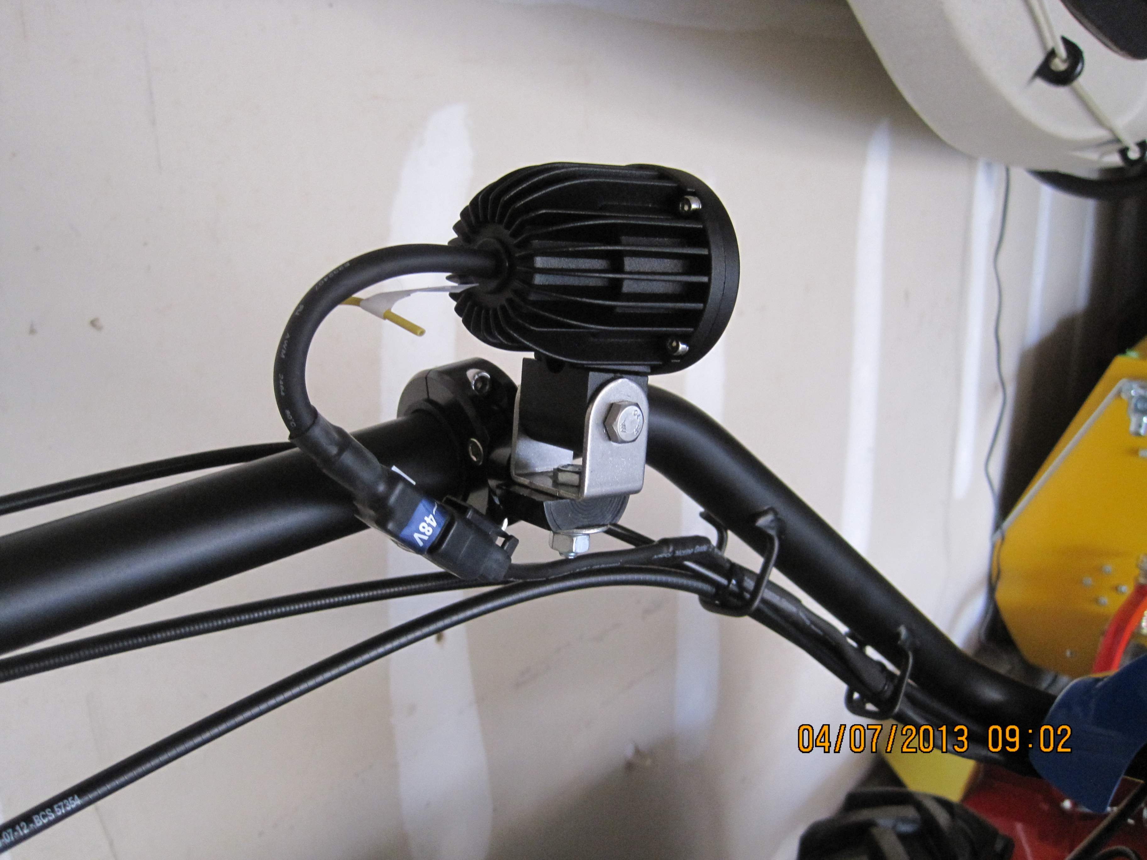 Did the same thing with the light. I just replaced my key switch(worn out) with a handle bar mounted on/off toggle and push button start. (No kids around, no real safety concerns) Where do you get the hour meters and about how much? All my seasonal equipment gets serviced at the start of the season-need to do that now-- but my BCS runs year round so knowing the hrs would be nice.