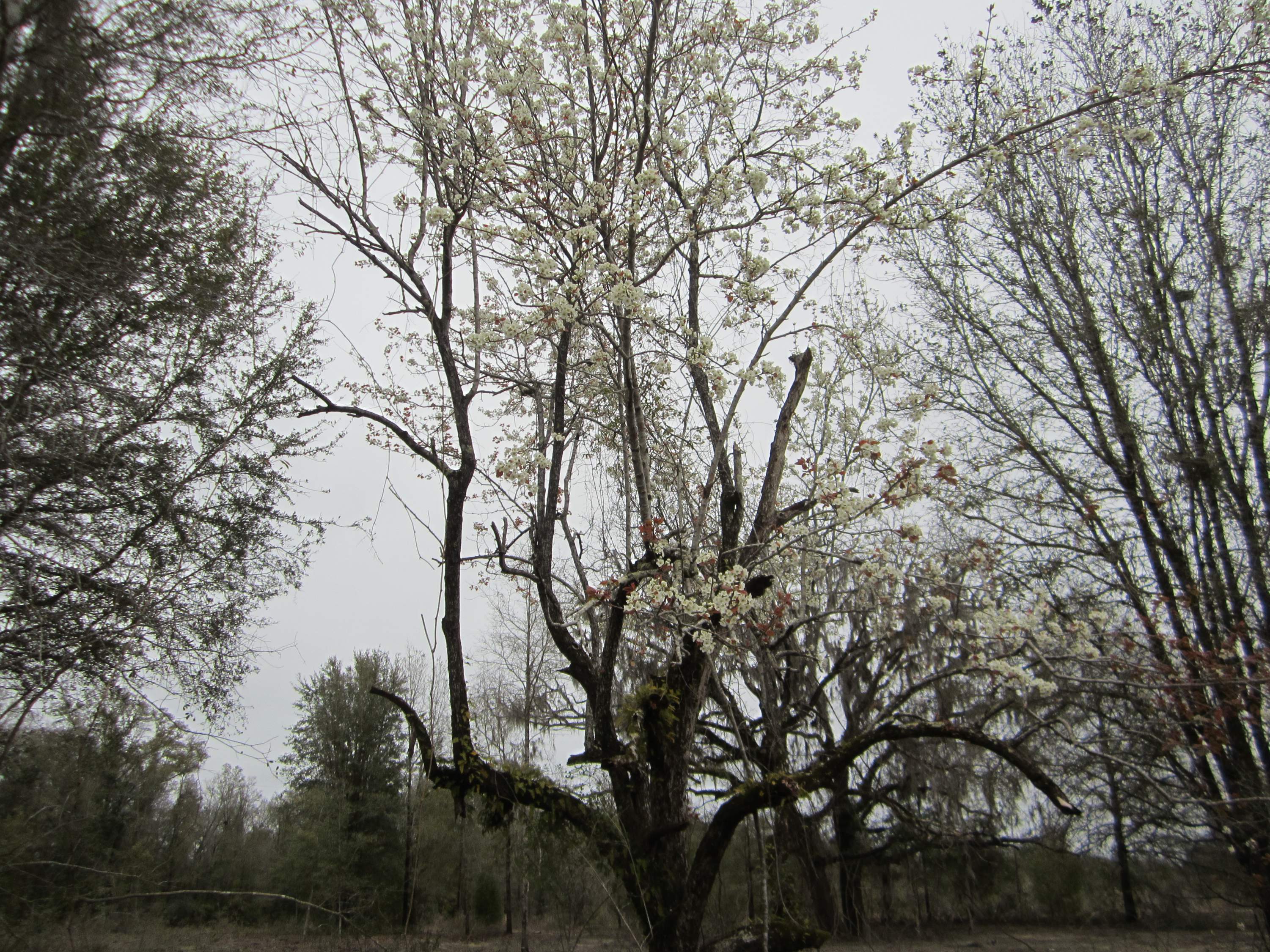 This morning when I was out for my walk, I saw the pear tree on what was my great, great granddaddy's homestead place was blooming. Since my cousin sold her pines, you can see it from the road. I walked across and took a few pictures. The tree looks like it could have been planted by him. It is more dead than alive. The fern is on one of the lower limbs.