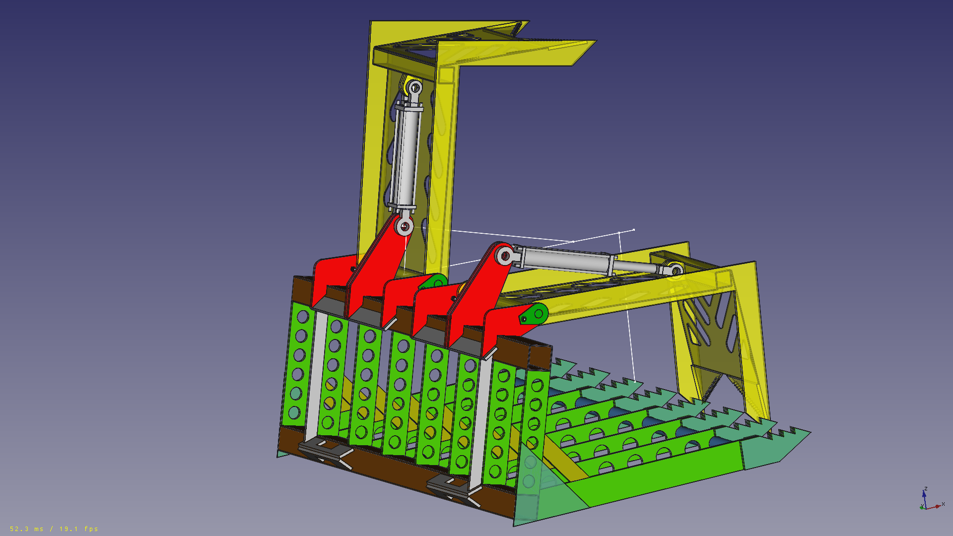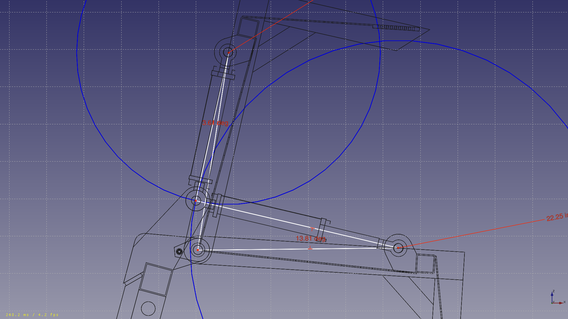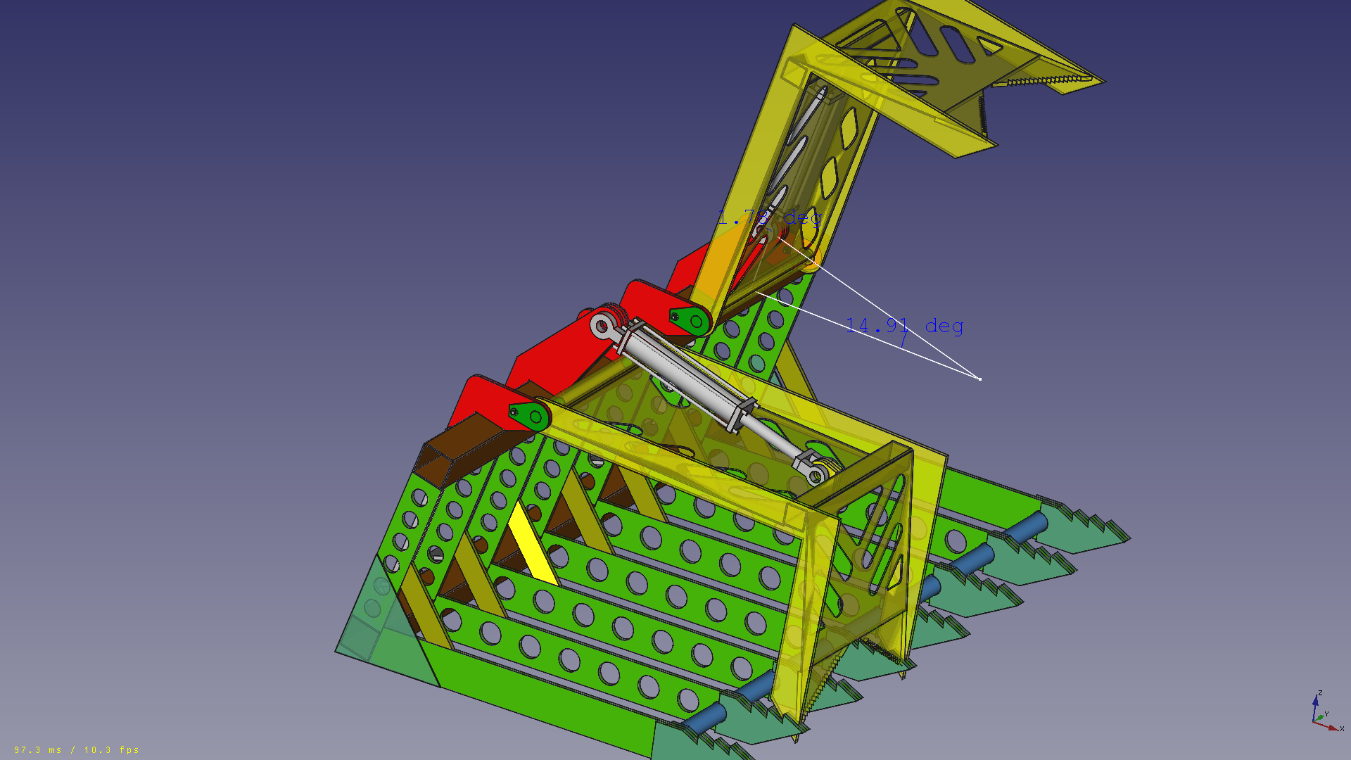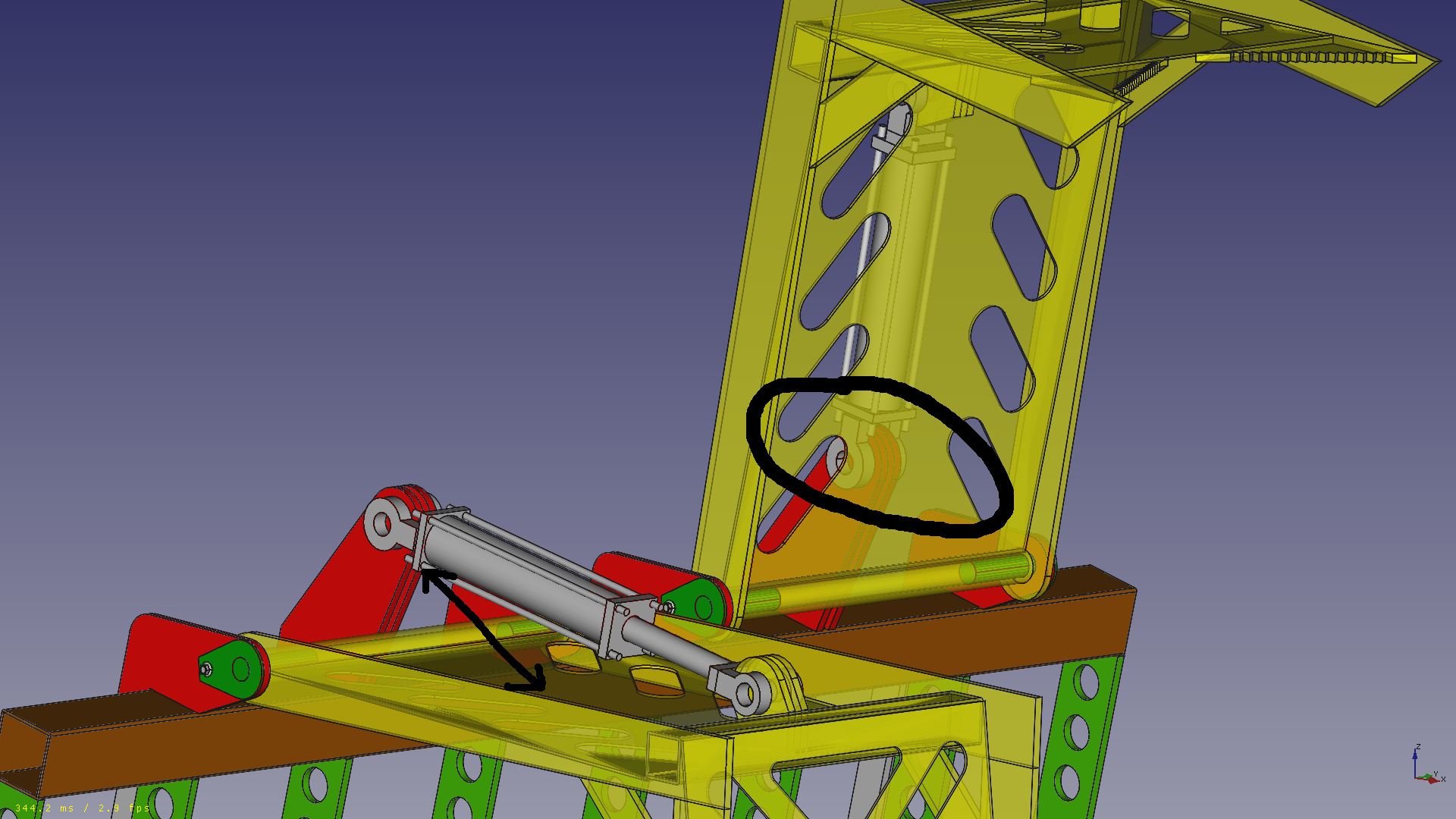 It is that way. On the fully closed position the cylinder could extend the lid 2 inches more. But on the fully open position, I do worry that even though the cylinder ends 1.7° before the lid would turn the other way (backwards) thats not enough security. I can easy increase that angle and also make some mechanical stop. If you pay attension on the opened lid, it already touches the red anchor point of the base of the cylinder. Maybe thats some extra safety.