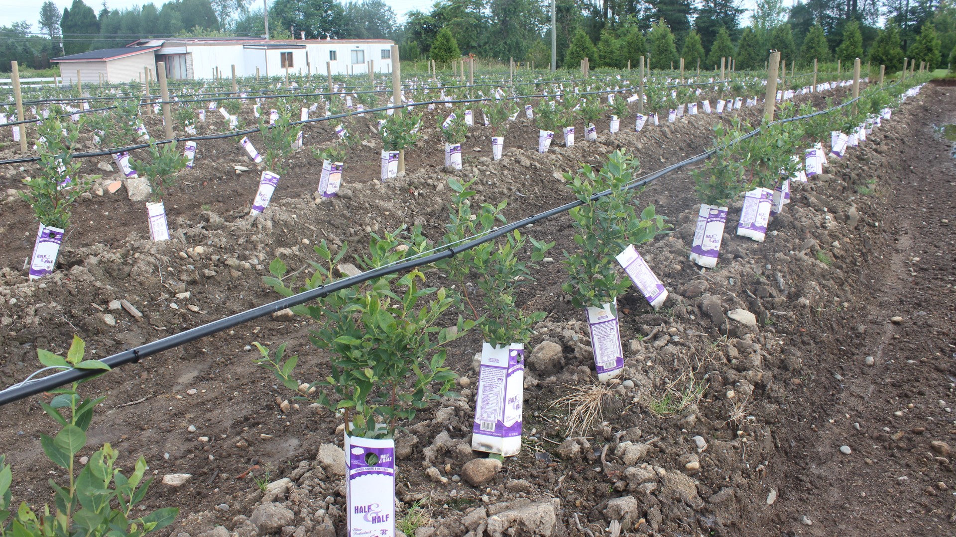 Usually, new growth dying back on newly planted bushes, is related to frost, or Phomopsis.