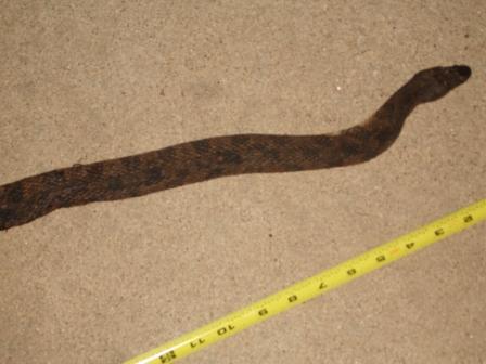 A diamondback watersnake is what my Ag Ex. Agent says it was too. He said they were non-posionous, but have quite alot of bacteria in its mouth so if my dogs had been bit a nasty infection would likely develop. Luckly no bites to the dogs. I typically relocate any snakes on my property because they help control the rodent population, however it is good to know that my boy can walk around with the dogs and be somewhat "safe" from snakes. So far in the past 5-6 years, these dogs have taken care of at least 4 copperheads, 2 cottonmouths, 3 king snakes, several small snakes and now one diamondback watersnake.