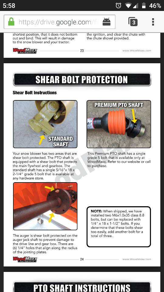 I just went back and enlarged aczian's attachment (comment #3). On page 24 the caption on the lower left picture states there are six 1/4" holes in the flanges on the augers. The "note" states the machine comes with two M6 grade 8.8 bolts [116000 psi so grade 5 (120000 psi) for practical purposes] but these may be substituted with two or three "1/4" x 18 x 1-1/2" bolts". One-quarter inch = 6.3 mm so grade 5 1/4" bolts would be stronger than grade 8.8 M6 bolts; 3 of them would obviously be stronger than the 2 original bolts. SAE 1/4" bolts are usually 20 TPI (coarse) or 28 TPI (fine); 5/16" bolts are 18 TPI (coarse). This may be a typo, but that and the lack of a grade spec for the substitution gives me pause. You might e-mail Woodmax for confirmation and to have something in hand if there is a warranty issue.