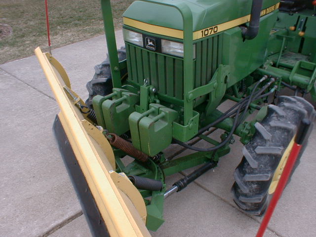 8' Western truck plow underslung from tractor frame. Loader hydraulics for up/down, swing left/right. Float or down pressure. 2 bolts and a cylinder pin + 4 hoses is all it takes for on and off. Truck 1 way cylinders don't mind the 2000 psi from the tractor. I use car brake hoses to slow down the swing angle. Mushroom slippers set the blade 3/4 inch above the gravel. Never looked back. I can run in high gear down the county road if I have to. I've been using this setup for almost 20 years. Takes me 10 minutes to install (usually while the weather forecasters are spewing about our first storm. 2 minutes to remove. Best to have plow as close to front wheels as you can get it. Sometimes I still use L and R brake to spin it around for a U-turn. 90402086.jpg