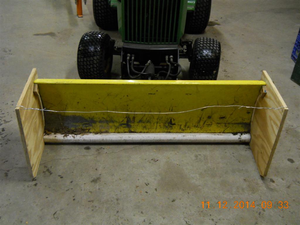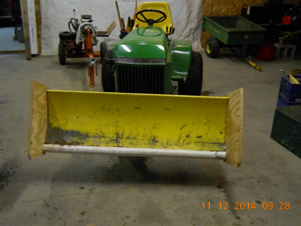 I normally run a snowblower, but here is my snow pusher I use for lesser snows... like the 6" of lake effect we received this morning. Just adding wings to my 54" front blade on an about one thousand pound JD 420 garden tractor. Two range HST, Onan 20hp. Just put two 100 pound Allis Chambers weights on the rear this year, usually put four... and she will push straight ahead until the engine stalls.... unless heavy ice. Used to use just one plastic pipe on the bottom edge, but now I am adding a second PVC pipe over the first. Having a harder time finding the black plastic pipe. The inner pipe seems to keep the outer one from cracking as easily. This setup I am putting on this year is new, with one of the older 'wings' shown in one of the pictures. When I got it assembled, I put a fresh Tractor Supply electric fence wire on the top to keep it from spreading. The bottom rod [ 1/2" stainless bolt lengthened in the middle by adding some 1/2" rod ] goes thru the angle brace behind the blade, and the top rod is a piece of 1/2" galvanized pipe. The rods hold the 3/4" plywood wings in place snugly on the end of the blade. I put two small woods blocks on the front of the blade to hold the wings in place on top. And the added wire keeps the wings from trying to spread too far apart. Anywhilst, this is how I have been doing it for years.... :)