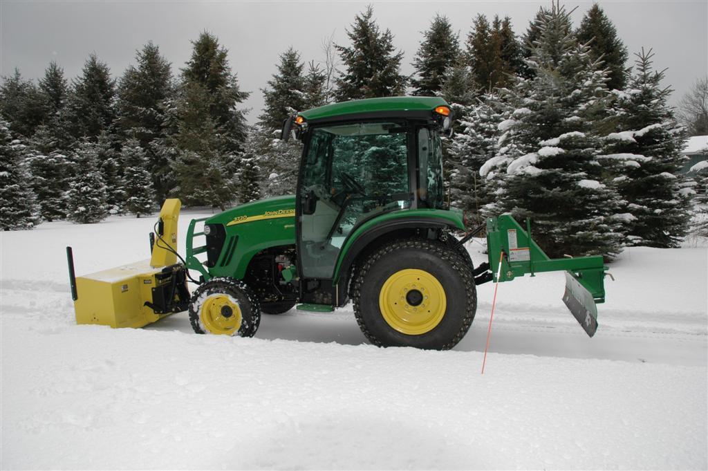 My neighbor has a front mounted blower and the rear blade. In my opinion the disadvantages of this arrangement far outweigh any advantages. His biggest complaint is the half day required to hookup or remove the front mounted blower. The next problem is the fact that the rear blade has no downforce which is needed to remove compacted snow. The last problem is the loss of the FEL to move snow or drag the snow back on to the path to be blown away. I have a 4410 with the Lorenz 60 inch rear blower and a front end loader. In the winter I put on a Curtis fiberglas sunroof which has clear vinyl attached to both sides and the back. The bottom edge of the vinyl has a pouch into which a 3/8" long chain is placed to stabilize it. This partial enclosure and the hydraulic operated shoot on the blower takes care of 95% of the snow that can be blown back at the operator. It is almost as good as a cab which would be problem for me in the summer mowing around all my trees.