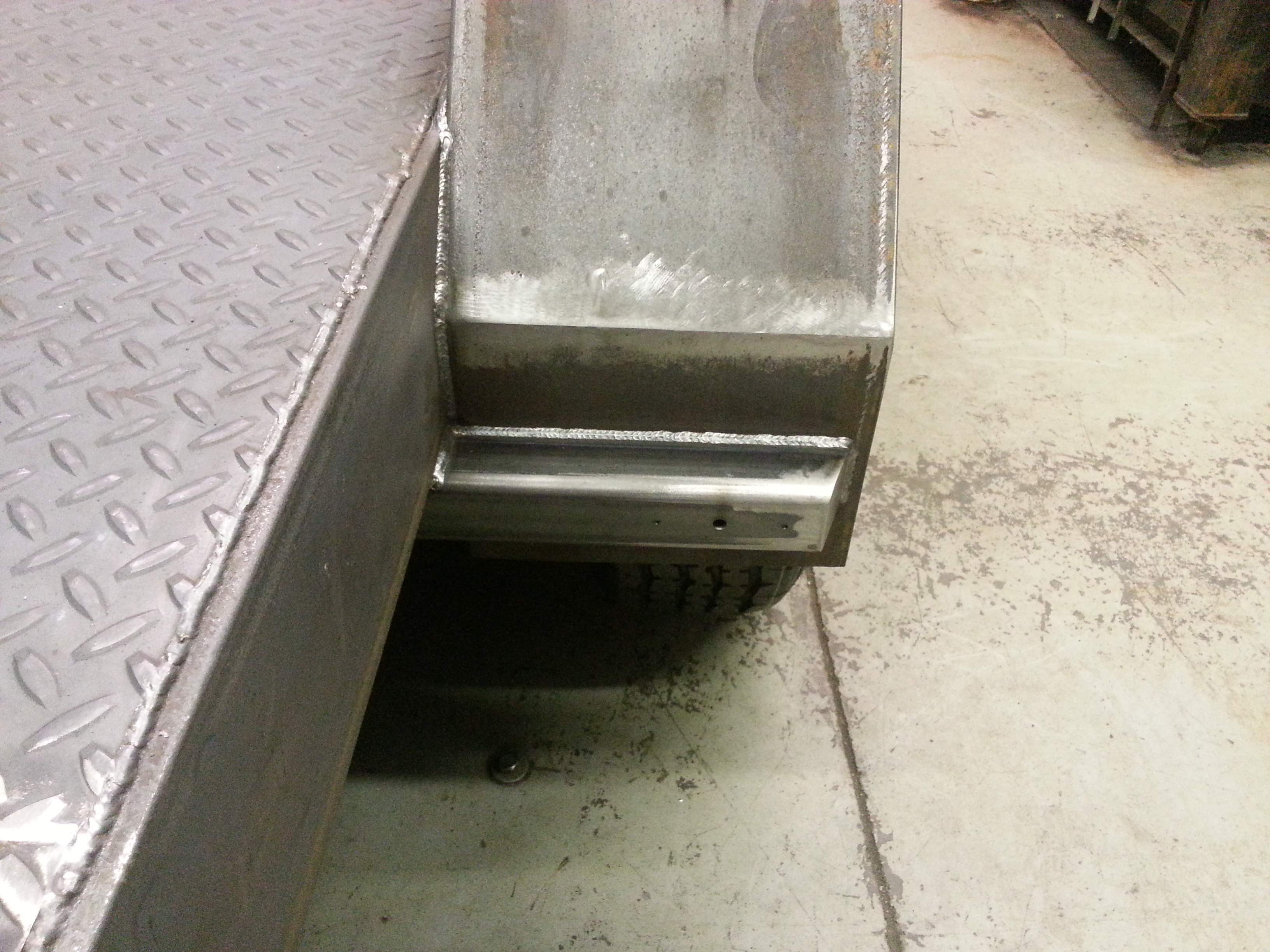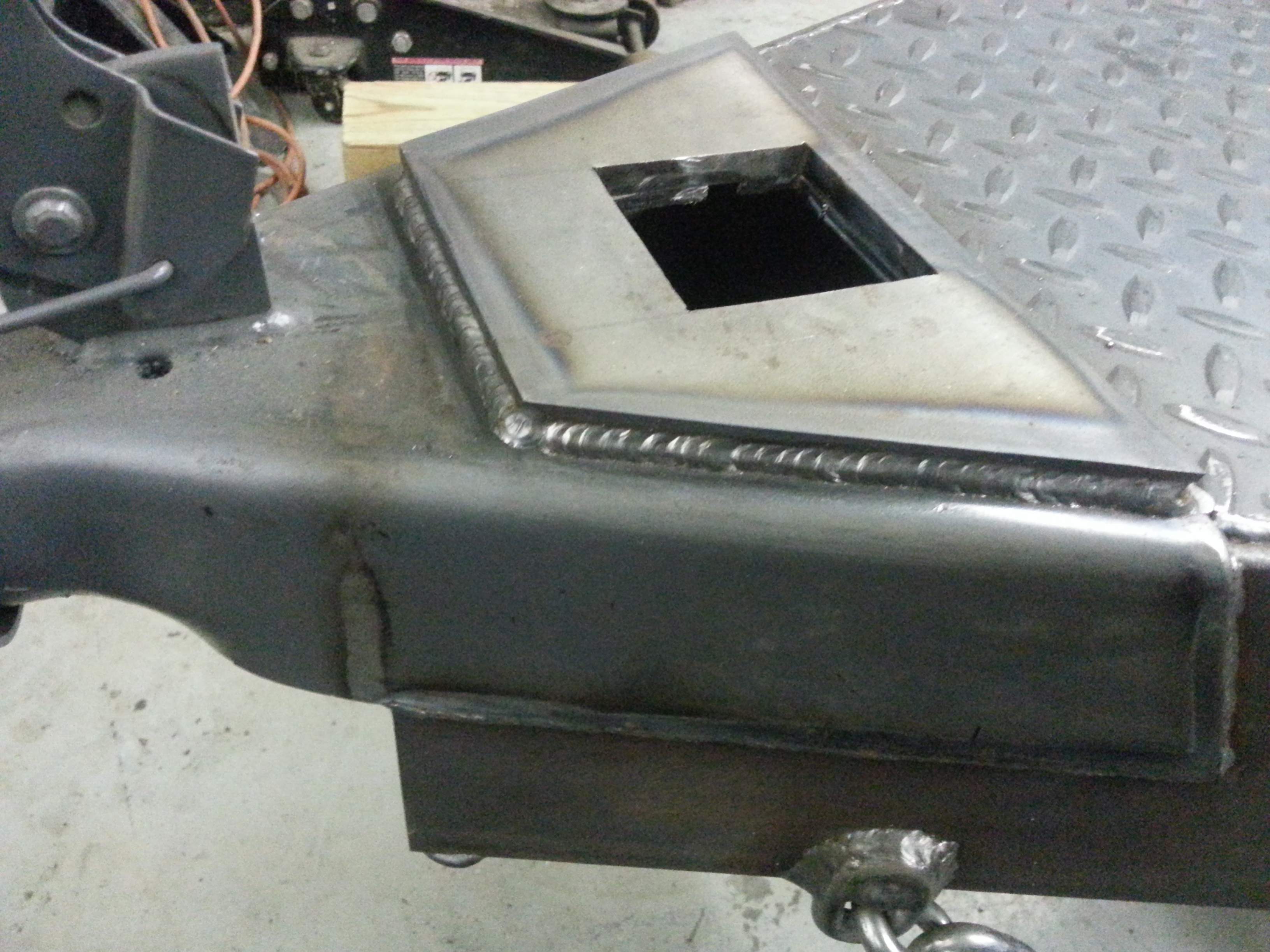 I decided to change the tongue jack for a heavier one sense I sometimes like to unhitch the trailer with it still loaded. I'm going to install an 8000lb side wind, drop-leg style jack. Here's a 3/8" plate I made to hold the jack, it has a 4" channel gusset under the plate. Hope to get the jack welded on later tonight.