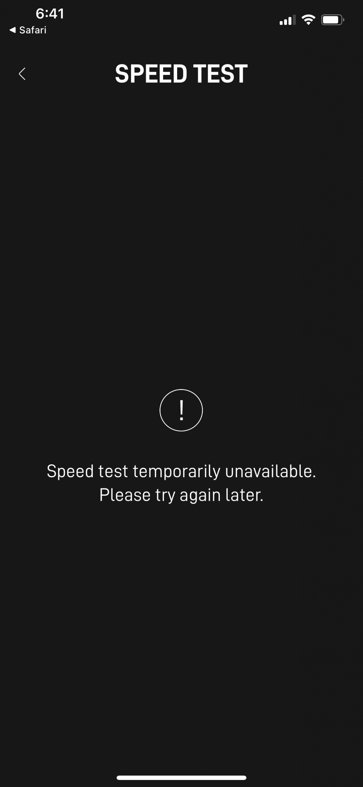 Today I looked for updates again and they released one 3 days ago. I did the update and now it works with one glitch. When you first open the app and run the speed test I get the same message. But when you try again it works. It continues to work on until you close the app. Then I get the same message only on the first test. Lol