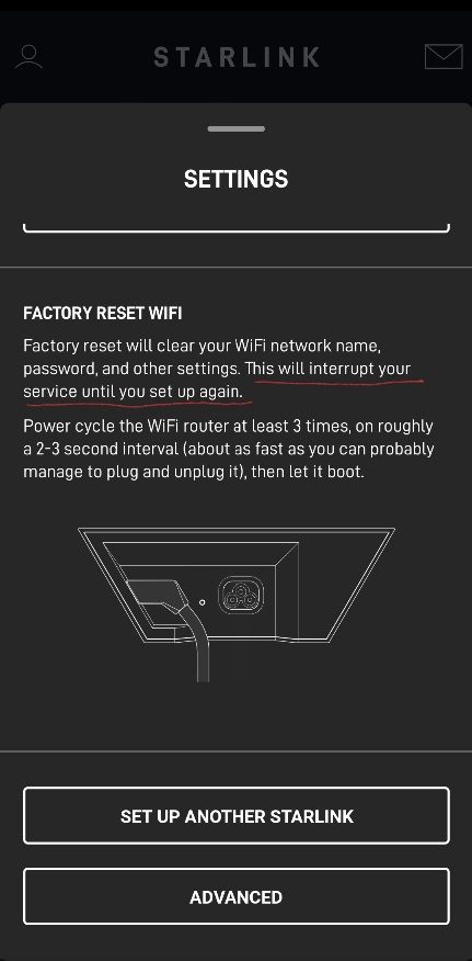 This is what I did initially when I applied power after hooking up the adapter, just to make sure I could see the Starlink router. I could se the router, but after 30-40 minutes the dish still said "Offline." Then I did the factory reset after connecting the adapter to my mesh. I could then see both the Starlink router and the mesh, but still had the "offline" indication in the app. After the second factory reset I took the adapter out of the connection and I could connect and get online.