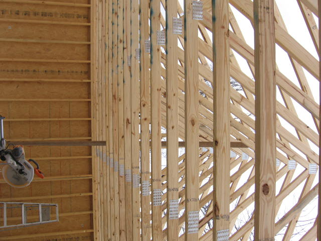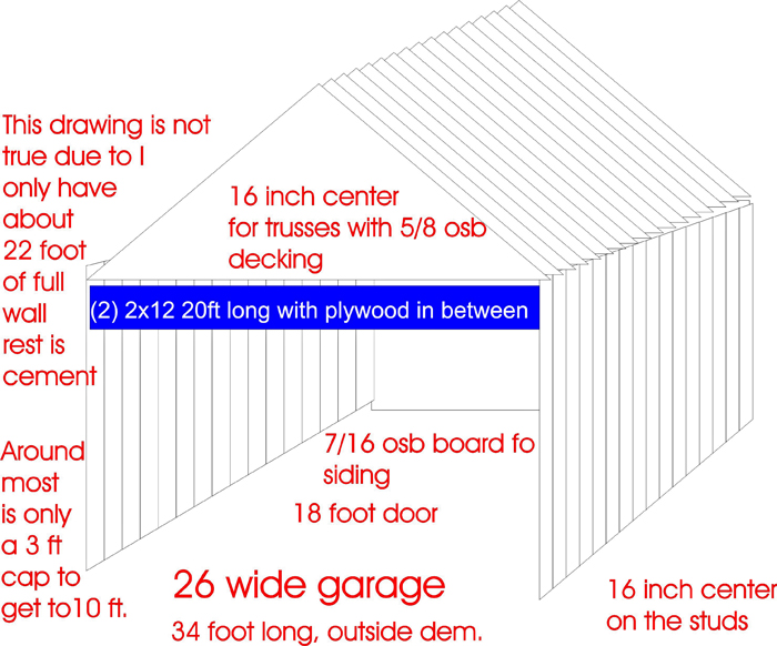 When you put your trusses up will they be running parralel with the garage doors or will the ends of the trusses be sitting on top of the header for the garage doors. The reason I am asking is because when I started researching the project I was going to do the two 2/x12 pieces of wood as headers. My 28 foot trusses have the end sitting on top of the headers. (not directly on top there is the top plates between them and the headers) everything i read on the web said that the 2 x12 double up would not carry the weight. I asked my neighbor who designs trusses for a living and he said it would not carry it. I went to a LVL beam to carry the weight. Each of my garage doors are 16 feet but it sounds like you are going to have similar issues if your headers carry the weight of the trusses.