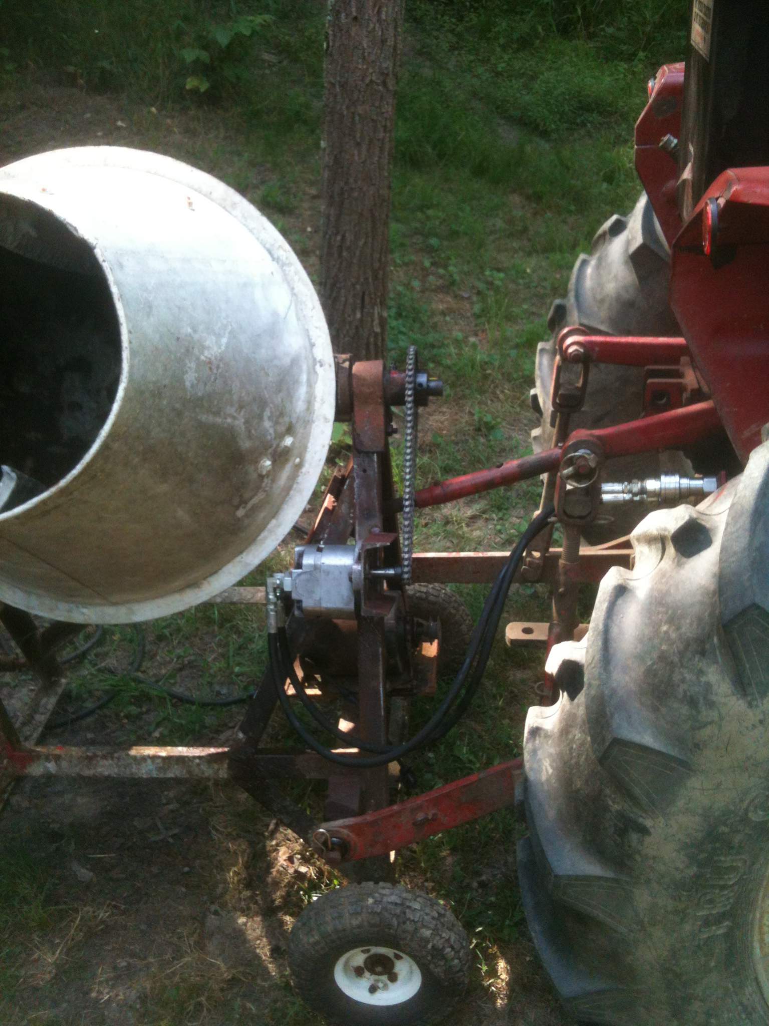 I modified an old Sears mixer to mount via 3-point hitch, and just last w/end modified it to run with a hydraulic motor off of my newly installed rear hydraulics Q/c's. Now I can run the drum by changing position of my selector valve. I left the electric motor on it in case I ever want to run it with 120vac, by removing the sprocket and putting the pulley and belt back on it.