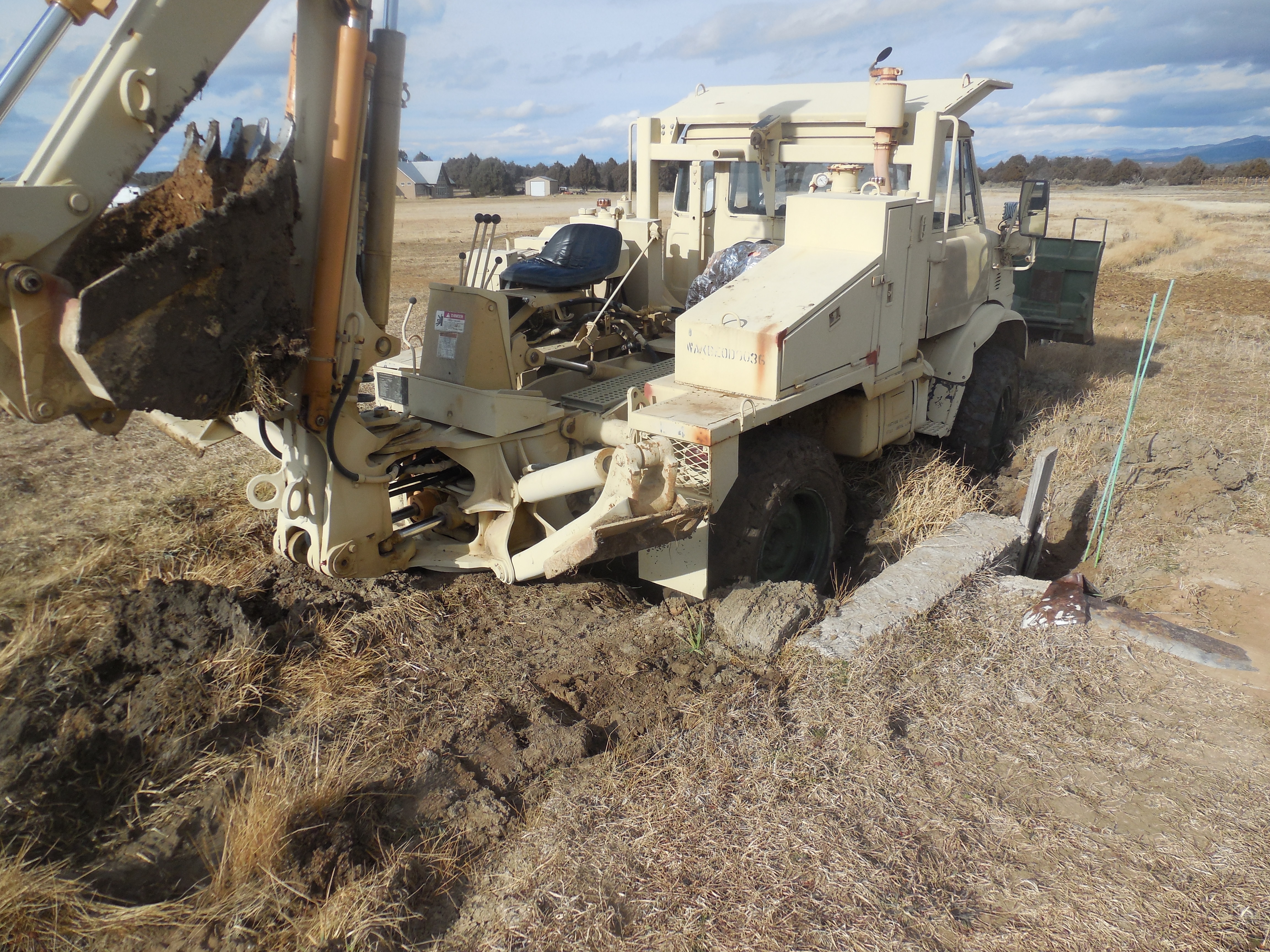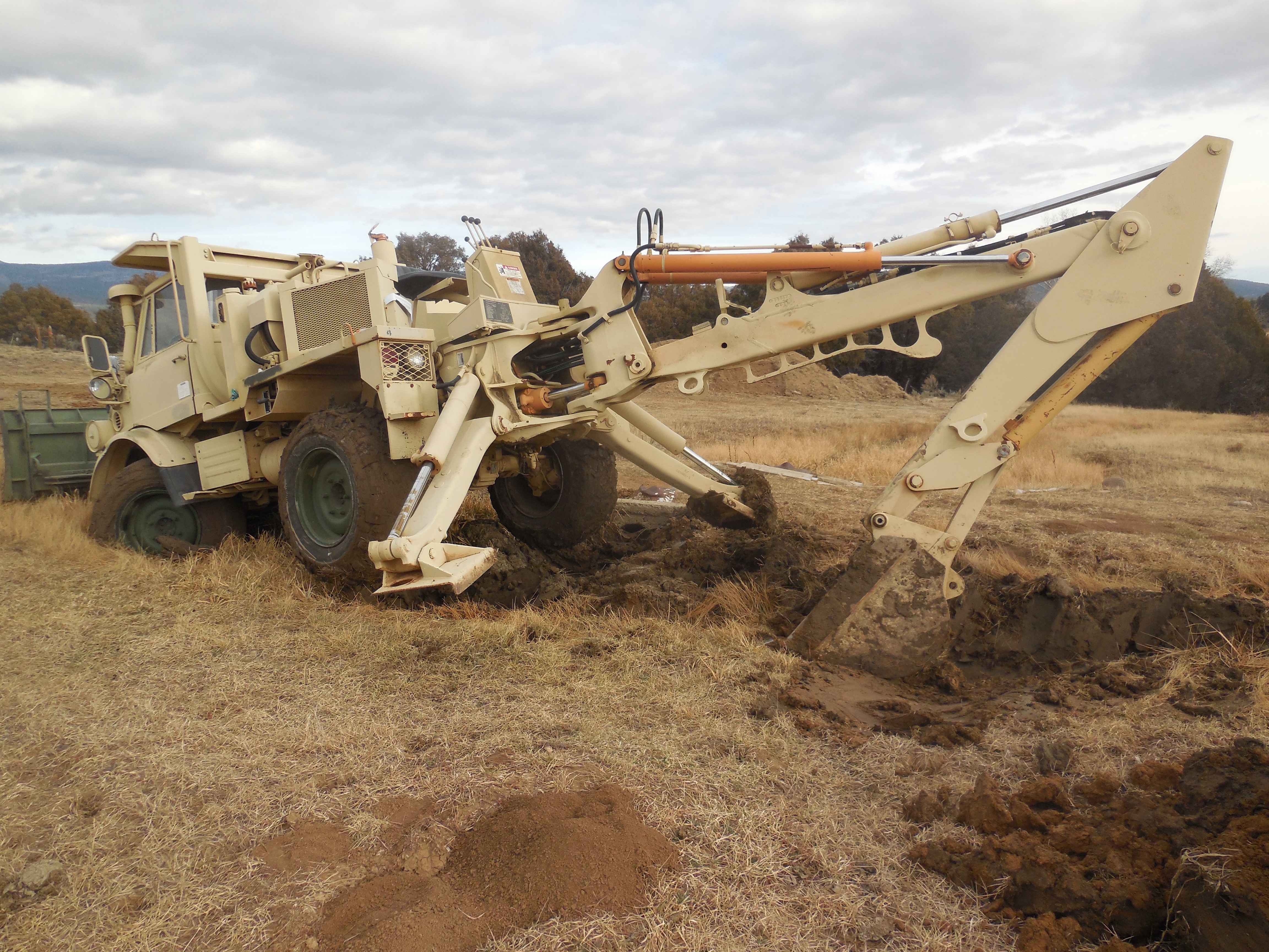 Digging a watering hole for deer (low lying land, water table is just six or so feet down). Going great, hit the water - now to clean up the dug out slop. That’s where the “fun” started. Using the bucket to smooth it out and 1.5’ from the hole was too close, all tires stuck and just a bit of spin and I slide backwards/left into the hole. Three tires are out of the hole - but rear left and the backhoe are in the hole. LS 342 shuttle shift