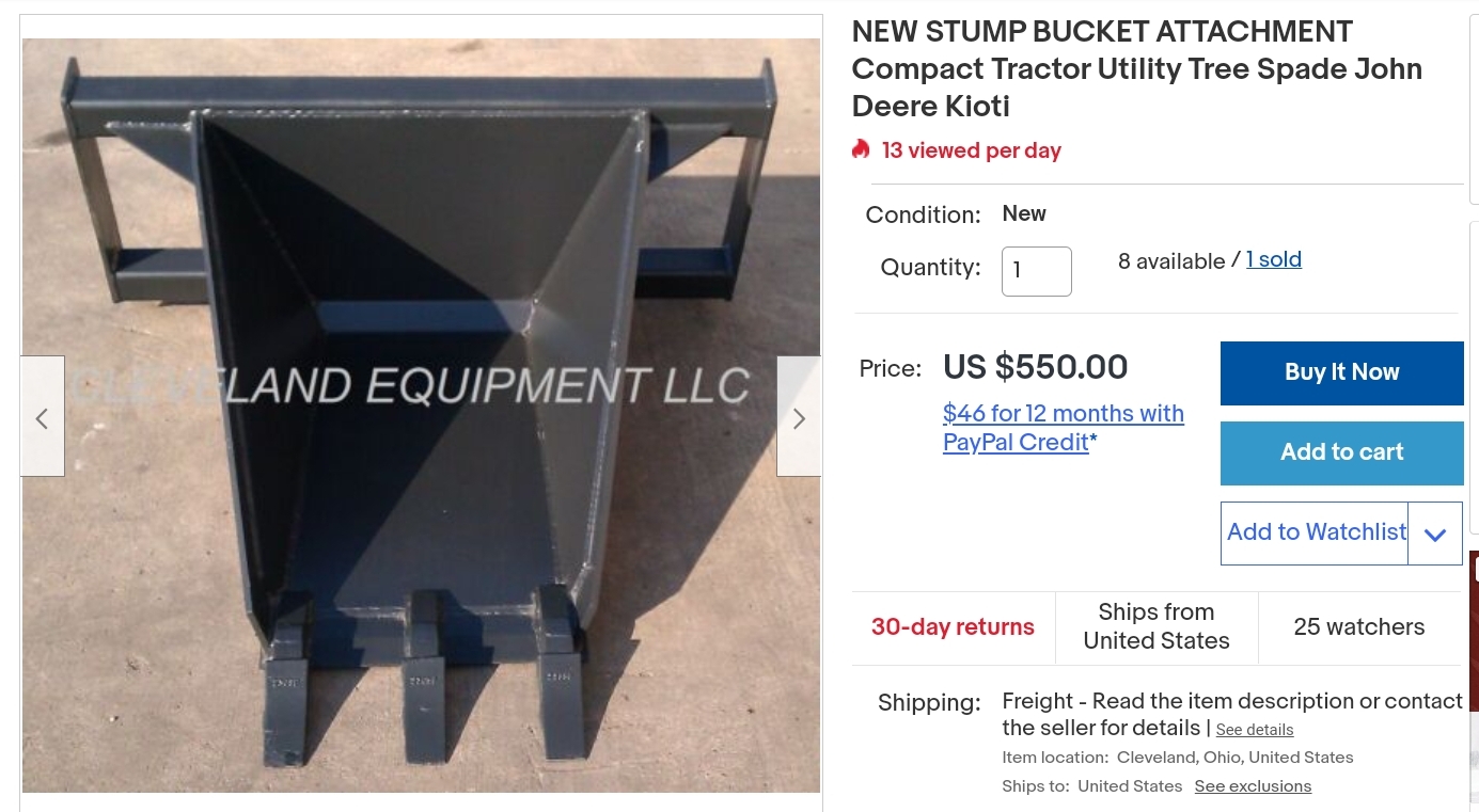 So it went like this: Renting will cost around $299. Finding and purchasing a "narrow" stump bucket say $500 or more.