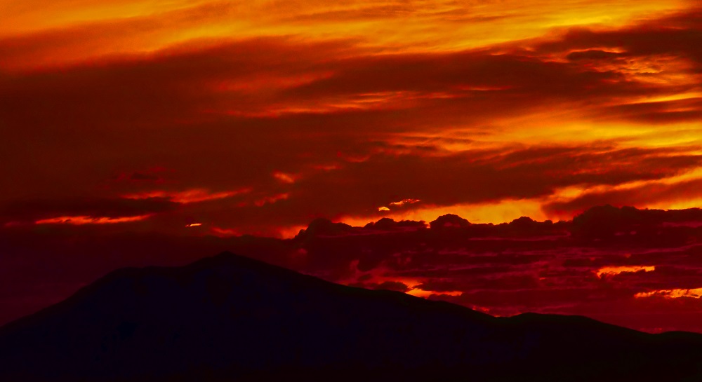 Wow... and no fires around?It was hot today - officially 99 degrees for the high - and the skies remained cloudless until the sun was just about below the horizon. Then the clouds moved in, giving us another spectacular sunset.