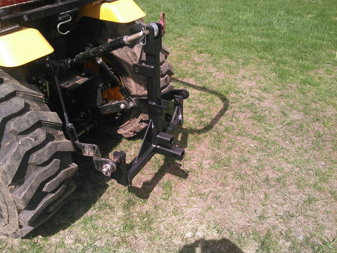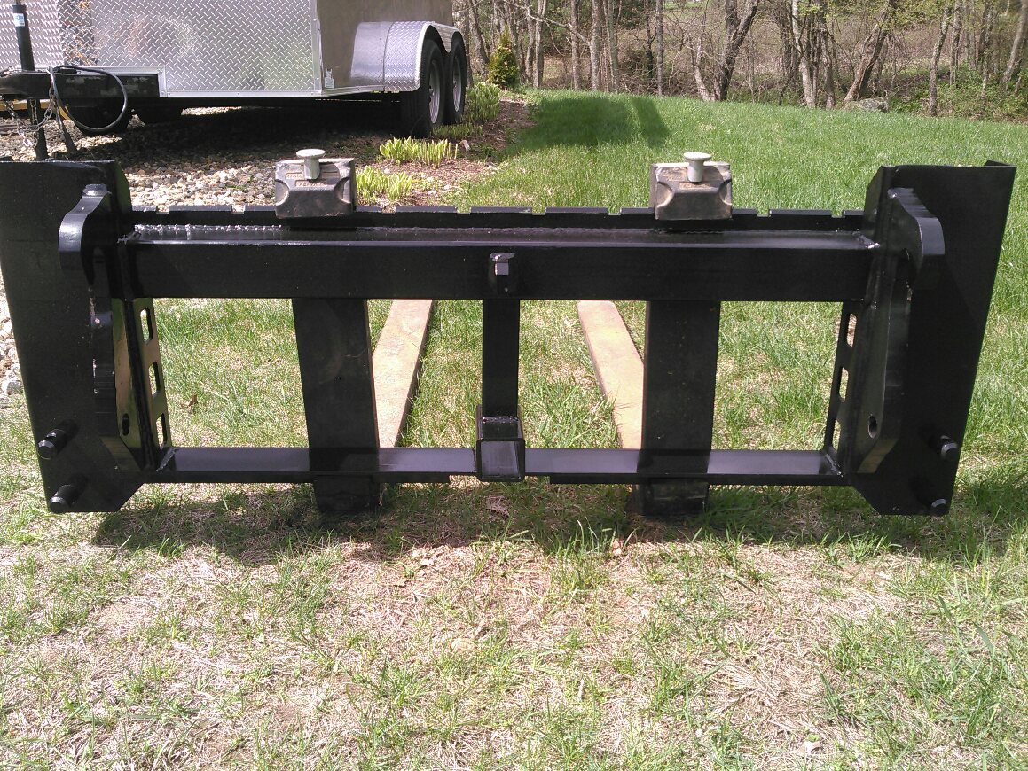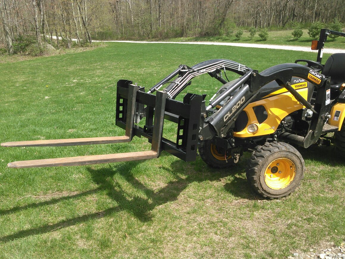 As you can see it is a Titan pallet fork frame that is made for John Deere Units(I purchased the scratch and dent unit). Fabricator removed the top two hooks used for JD in order to make room for the Yanmar loader brackets he fabricated out of 1" think steel. I also can use these same forks for the rear 3pt hitch. You can see the metal tab welded in the center of the top rail. I do not have pictures of that whole setup he made me yet i will try to post some over the next couple days. I have been looking for some time for forks with no luck so i found this to be my next best option. By the way for those of you who may be considering a Titan pallet fork frame i recommend it they are really nice units. Just wanted to share my new set-up. Also the green paint will not be around for much longer no way in heck is it going to stay.