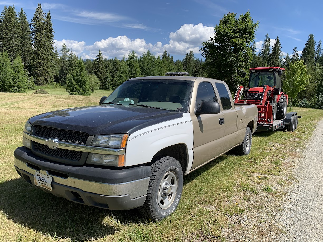 I have a 2000 Silverado 6 in lift with 35in tires. 5.3L Auto just under 300K miles. Trailer is 20ft 10K lb car hauler. T474,cab,loader, and backhoe. Truck pulls and stops(yes with brake controller) well-but works on hills. Trailer squats pretty good-not sure if an equipement trailer would handle it better? Pic is the day I brought Ole Red home