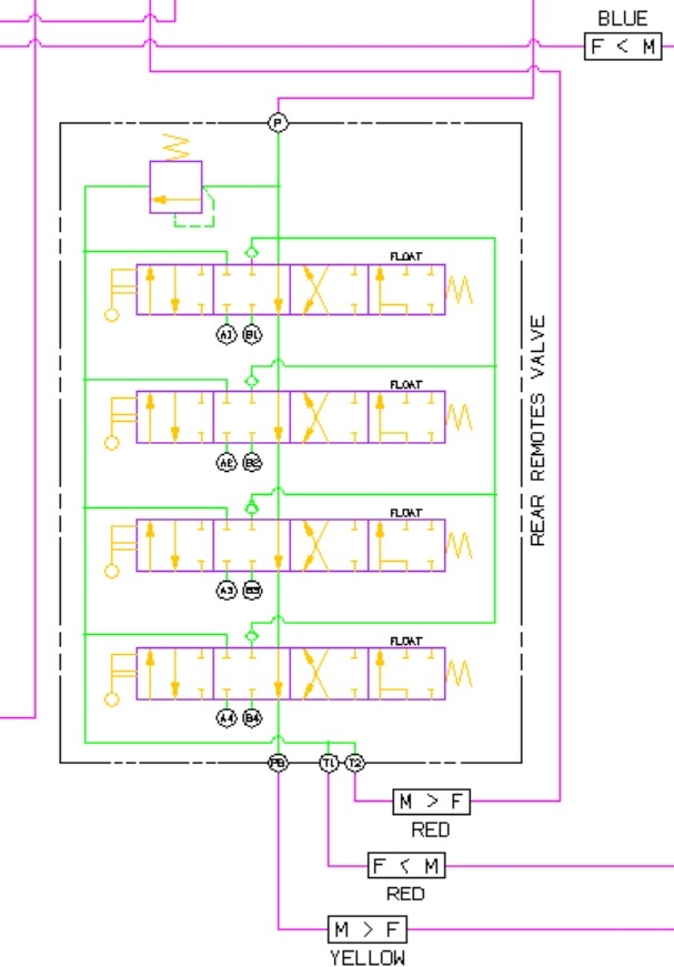 A message from Summit said: “Our valve manufacturer responded with this: "When the customer has a floating spool, if he locks it in position, the by-pass line is kept connected, so the next spool should work, but if the floating position is on the spool after, it will not work."” I’m still waiting on them to send me a correct hydraulic schematic …