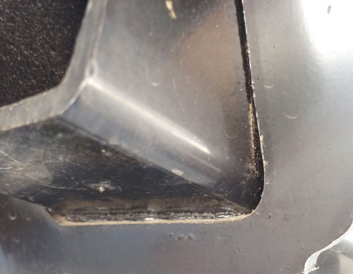 This looks like a weld defect to me. The arrow is where the joint is improperly joined, and the red line is tracing what looks to be a crack or pull starting where the weld is not properly tied together. If it is not a crack, there will eventually be one there I suspect. The weld will start to crack at the weakest point...and that is the weakest point from what it looks like.