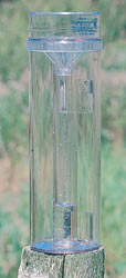 clear-professional-rain-R25103.jpgThis is the type of Rain Gauge the NWS provides to volunteer weather observers. The top is 4 1/8" in dia into a 1"?? (not sure...don't remember) tube. It measures increments of .01. This is from Gemplers for about $40 but might be able to find them elsewhere.