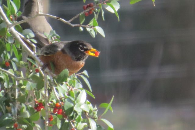 With any purchase of bird food Tractor Supply is throwing in a free bird feeder with coupon. I put it up two days ago and the finches found it! We also have a ton of Robins out here and today I finally found out why - we have tons of youpon berries that they like. Makes me smile.:)