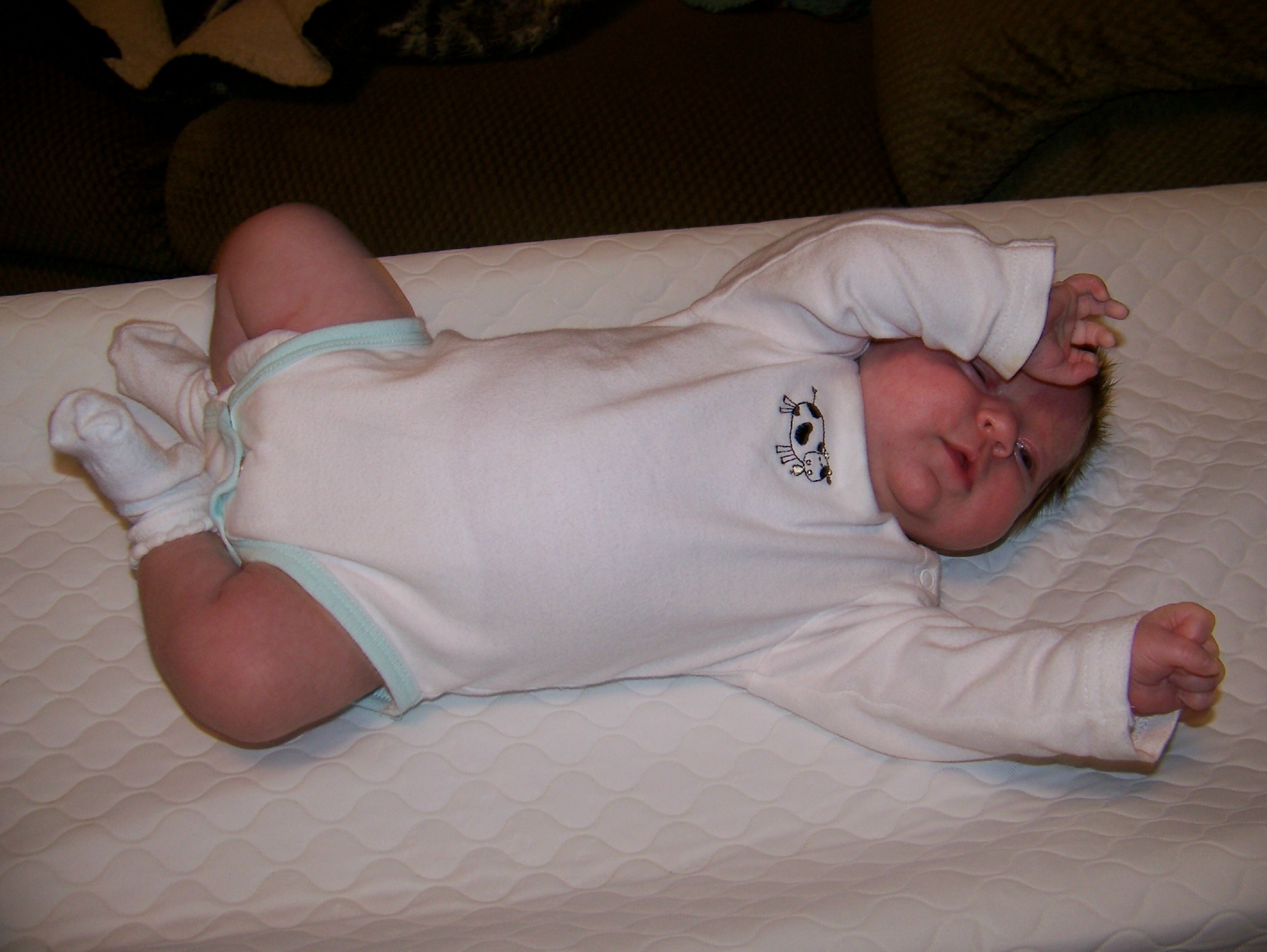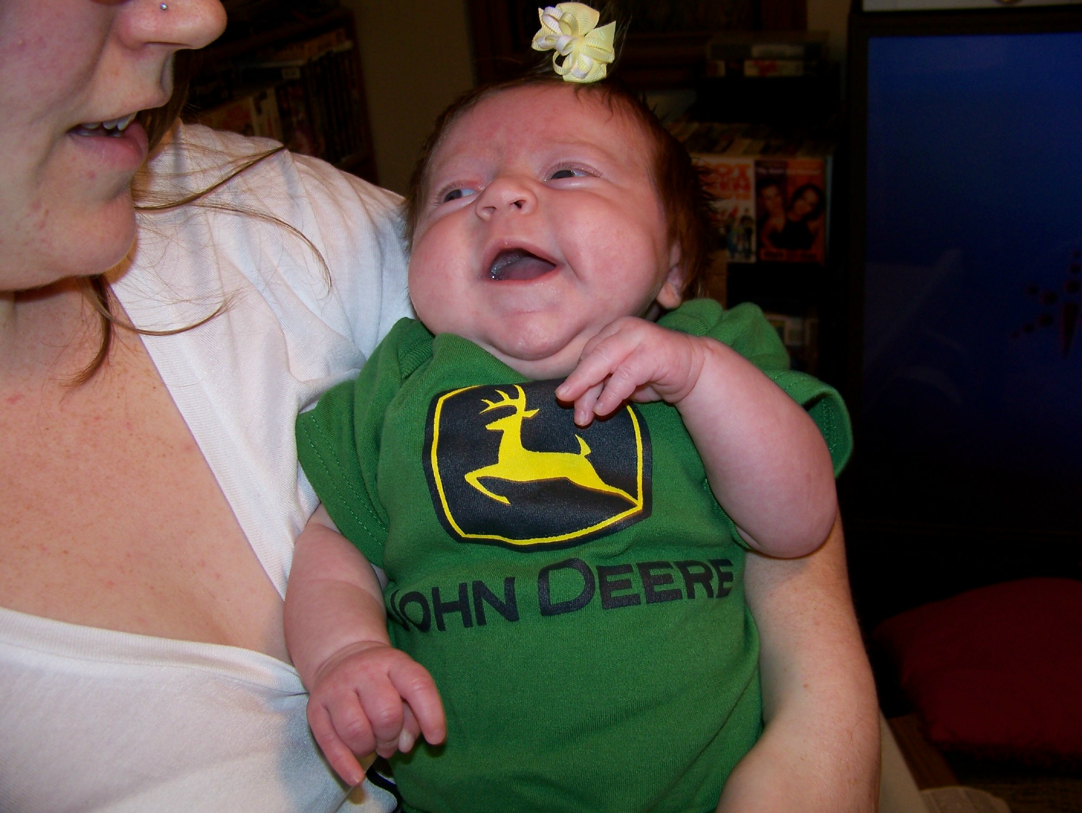 9-15-13 Chloe strecthing in Cow Outfit.jpg9-15-13 Chloe in JD Tractor Onesy.jpg