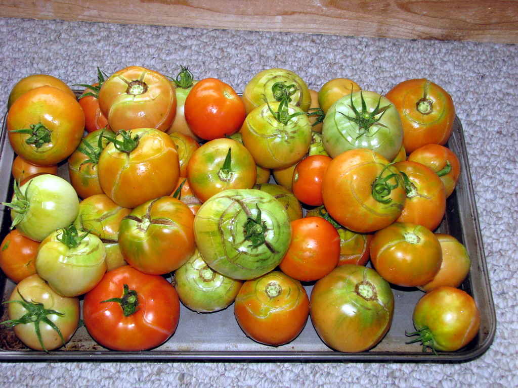 I'm up to 2.5" and a steady rain is falling. I'm happier than a sunblock salesman at a nudist colony.:D I went to my garden this morning, just because. I got a bucket full of squash, zucs, and cucumbers right away. I also found two more ****** melons that had turned completely yellow since Saturday. Then, I started looking and tomatoes and my spirits dropped a bit. Now, I don't expect anyone to feel sorry for me because I don't feel sorry for myself, but I have probably 50% of my tomatoes "blowin' up" from too much water. They have cracks radially and around the circumference. I picked two buckets of bigger tomatoes and over a gallon of cherry tomatoes. Lots of them are just starting to turn pink, so I'll let them ripen in the house and make another big batch of salsa. I'll continue my survey of the carnage after the rain is over. Given a choice between perfect tomatoes and rain, I'll take the rain every time, but you can't blame me for being a bit disappointed in these tomatoes as shown in the photos. Several of them are not cracked or not bad, just a bit green.