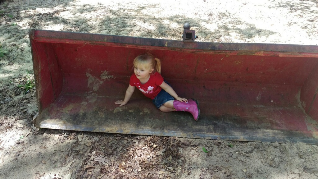 Rebecca and Chloe came over last weekend. She always wants to ride the CAT and the tractor. While I had the grapple on the tractor, Chloe took time out for a break in the bucket................View attachment 464648