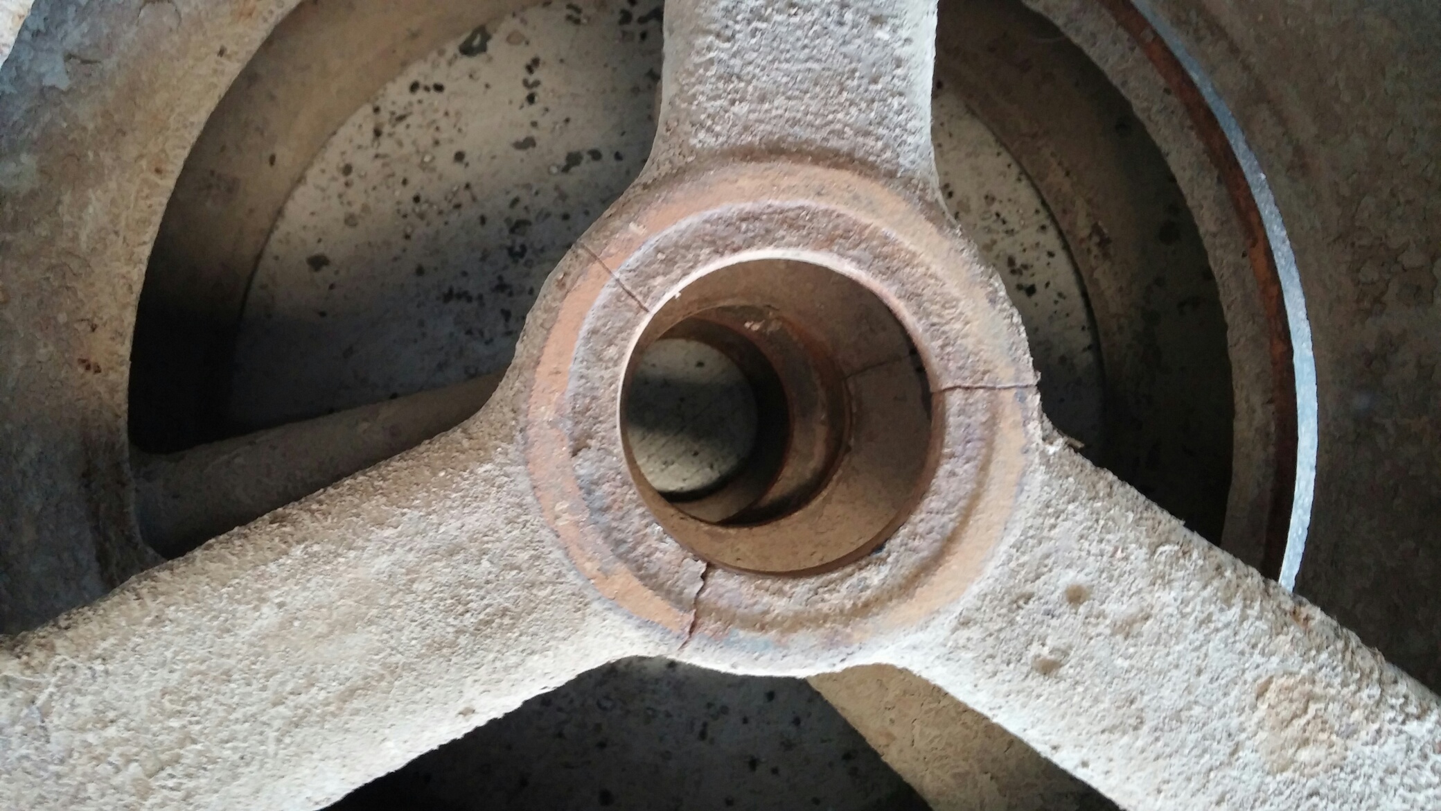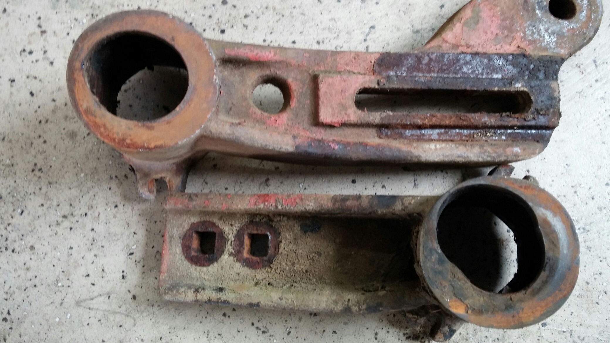 In your top picture, that bore is too far gone to try and bore it and put in a sleeve. Does the welding shop at your cc have a cnc plasma? Or better yet, a water jet? It would be a great project for a student to make a replica of that.Got the packer all torn down today and like anything that old it has problems. One problem that is easily, if not cheaply, fixed is more damage to the 15 inch wheels than was apparent at first. 12 of the 21 wheels on the front axle were broken or had cracks around the inner hub. I am hoping that the guys down in the welding shop need practice at repairing cast iron and maybe I can get off with just buying 3 new ones instead of 11. What I am more worried about is the "wallered out" bores on the castings. I guess I will have to see if a machine shop around here could help me. Back in the day when I worked at the machine shop for a coal company we would have probably bored out the casting and pressed a brass bushing in there for the shaft to ride on. A couple of those bores really got into the casting pretty far though so not sure what might work. I plan to put Polypropylene bushings in the castings instead of wood but the lip that secures the axle side of the bearing is gone so there is no support there. Might work for a while if I put some thrust washers against it and held them against the casting with a lock collar. Not sure this old thing is worth what I suspect proper repairs are going to cost so I might have to get some baling wire and duct tape and go to work!