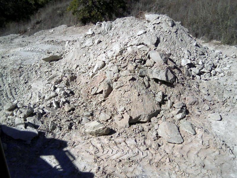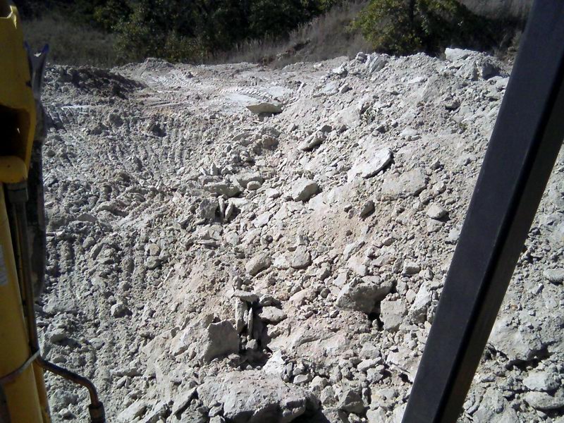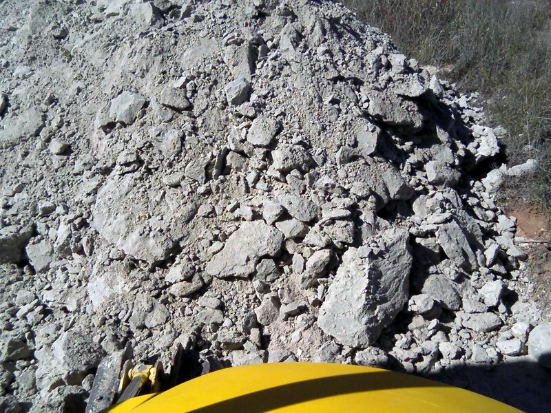Eddie: This caliche is not hard enough to crush for gravel. It pulverizes into dust under pressure. I can run over a big "rock" with a tractor wheel and it just crumbles. When it is in a solid layer, it requires the rock teeth on the bucket to scrape off chunks, but once the chunks are unsupported, they pulverize under minimum pressure. It would make good filler for road base, but you'd want a good layer of crushed rock on top to mix with the caliche.