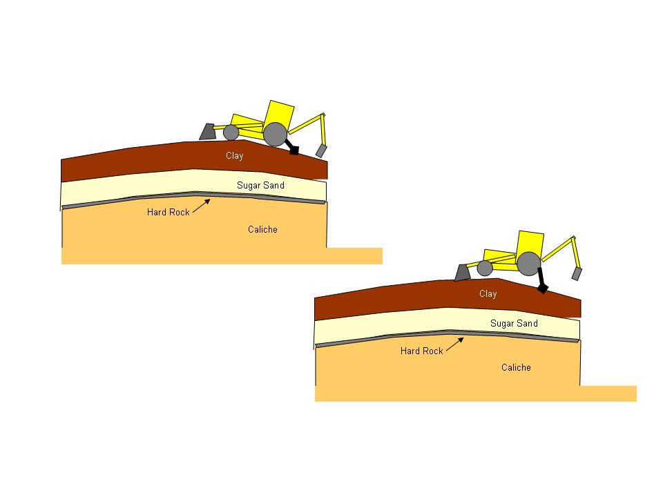 I've made a decision on how I'll proceed from here on out. (last attachment) First, I'm going to get the whole clay layer off and stockpiled for my dams. Next, I'll dig down and remove the sugar sand until I get to the hard caliche layer. Finally, I'll drive out on the hard caliche and dig it away. My strategy is "divide and concur."