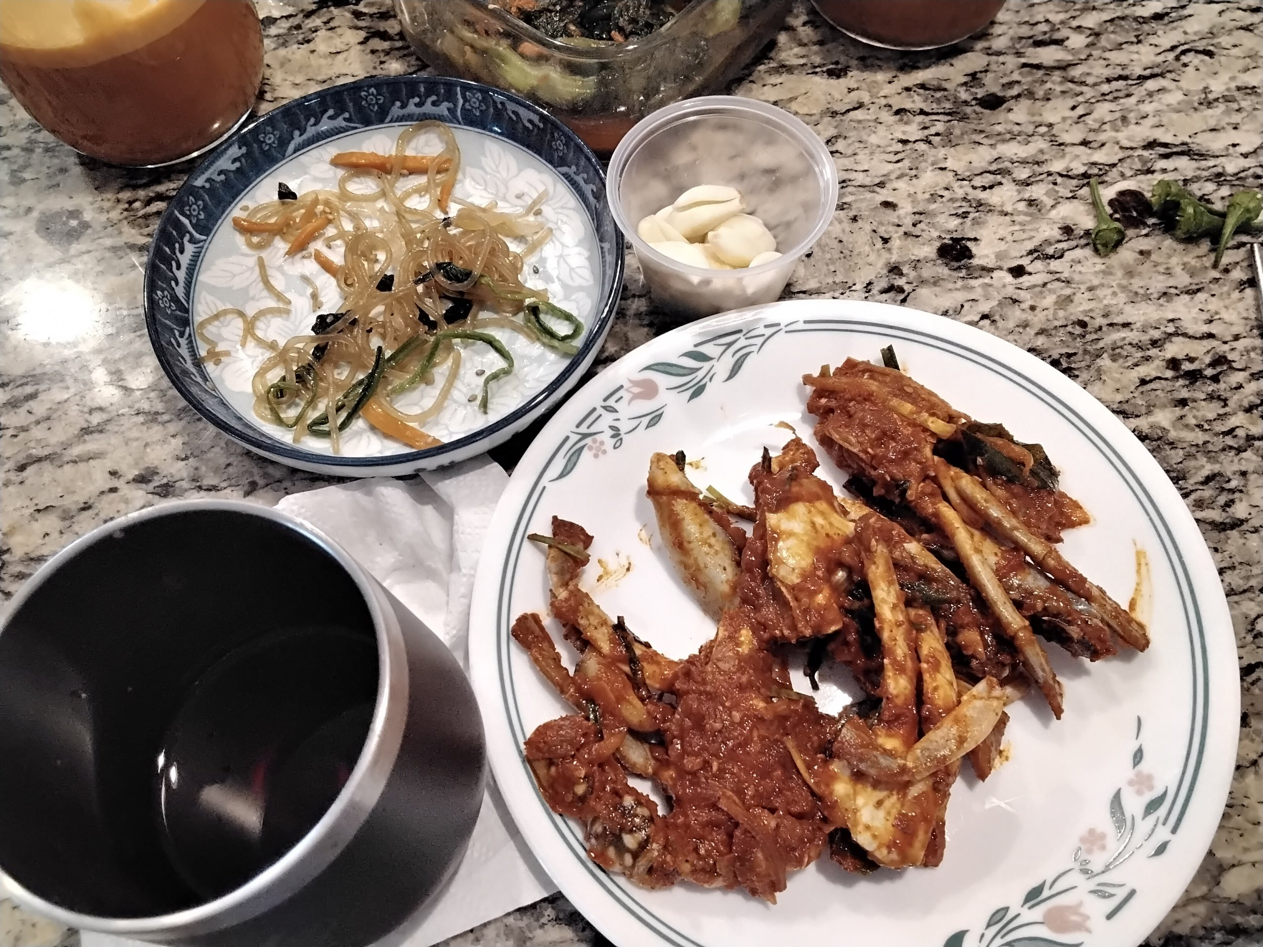 Raw garlic, spicy marinated crabs, Korean noodles and Of Course a cup of red wine..