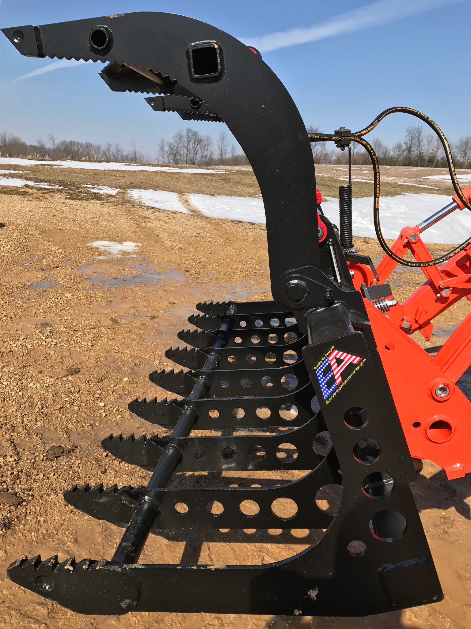 My tractor finally showed up and the grapple was the first thing attached! Before getting the grapple dirty I snapped a few shots....and snapped a few first loads. I am very impressed. I may have wanted some additional hose length. At full roll forward the hoses do utilize the spring loaded hose guide. It may be fine, but makes me nervous. I did lessen the guide and get a few more inches.