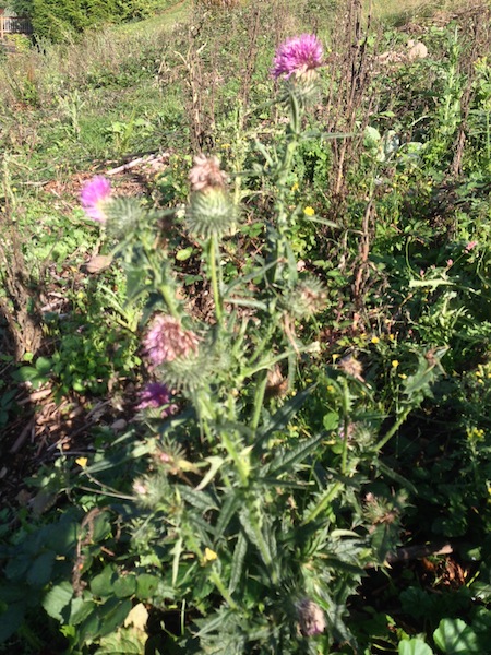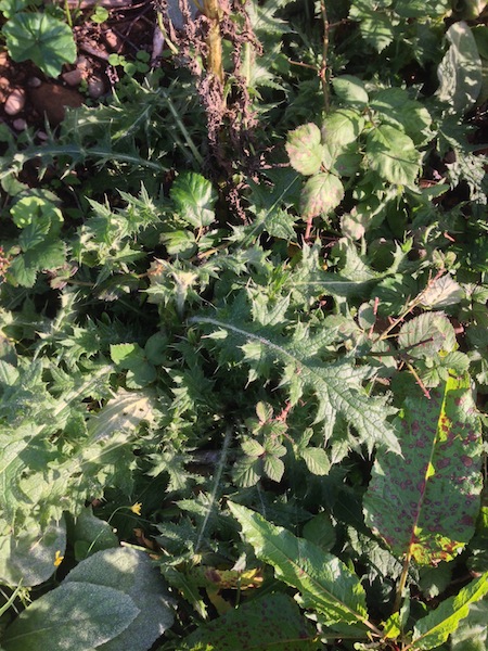 Pic #1 does look like Canada thistle, :(. #2 appears to be bull thistle, which is a biennial, and much easier to control, as it does not regenerate through its roots. Sorry to say, #3 also looks like canada thistle, and number four is also bull thistle. Bull thistle is easily controlled in small areas by beheading. The Canada thistle is going to be your biggest challenge. It has been there forever, hidden in the black berries. The root system is massive. http://www.btny.purdue.edu/pubs/ws/canadathistle/roots.jpg Somewhere I read the average infestation laid flat would cover ten square miles.