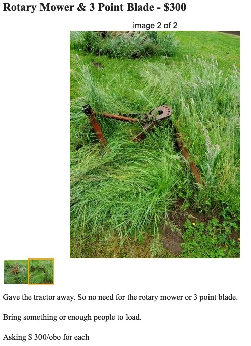 I'm not sure what's funnier, the pictures or the fact that they "gave the tractor away" and they are asking $300 each for the blade and mower.