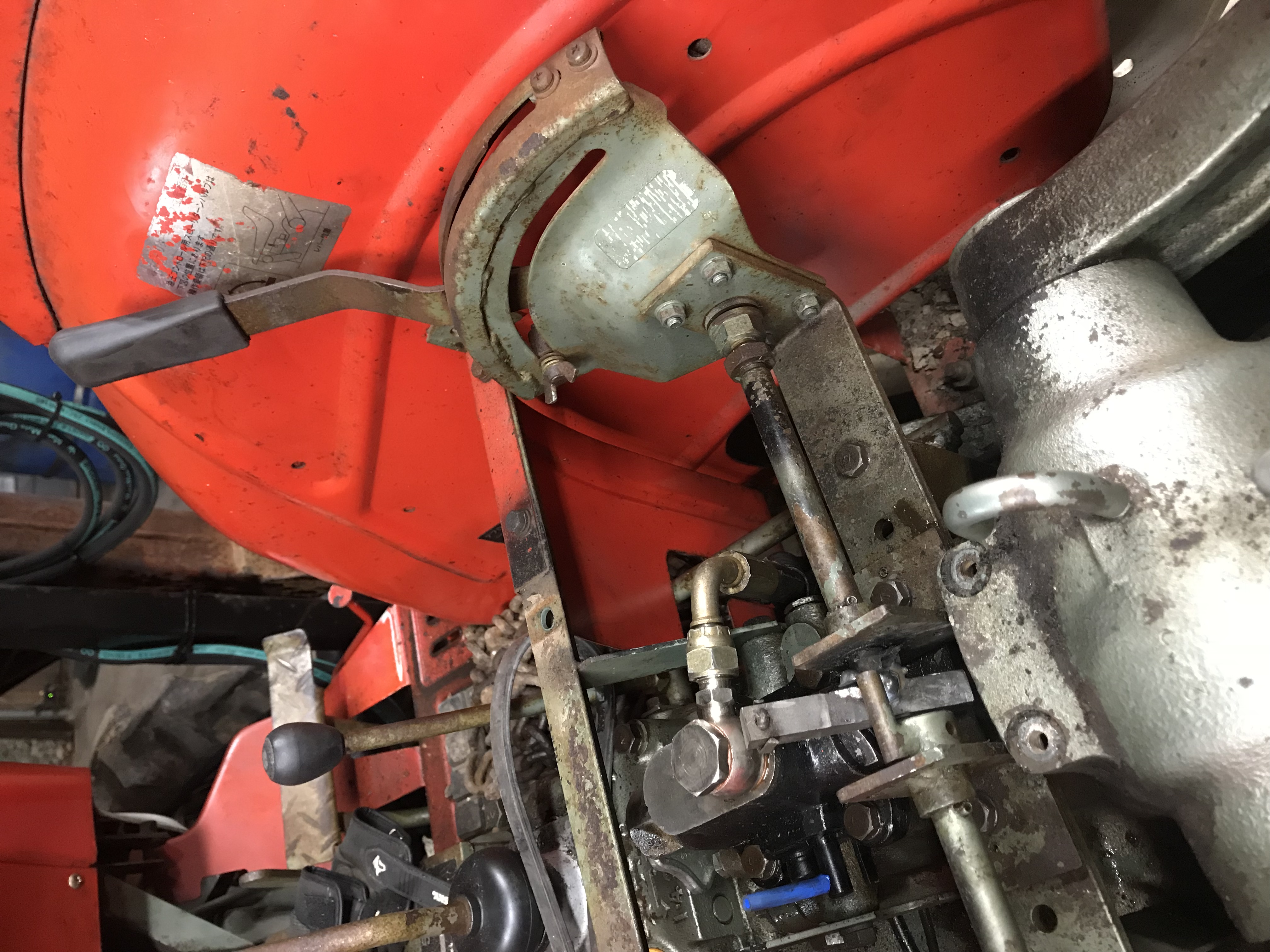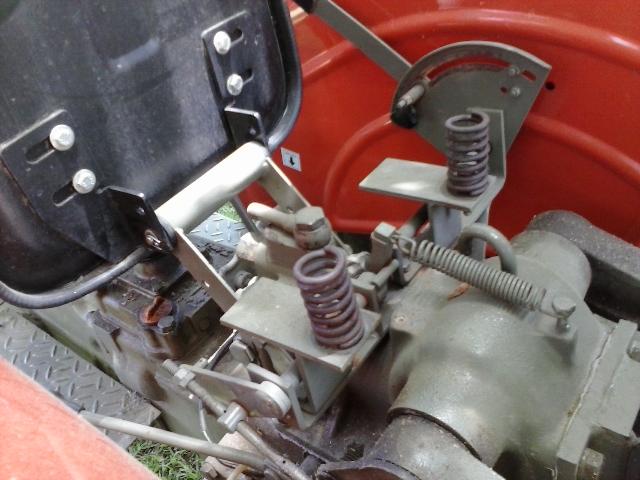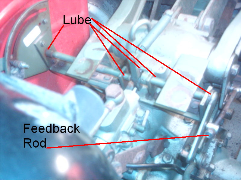 This photo from another thread shows the handle all the way forward, the linkage maxed out on the stop nuts, and the 3pt arms down, with the vertical arm that pushes the spool pin almost in a 0* position.