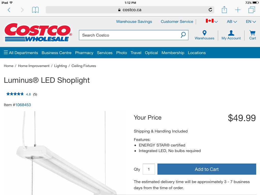 Love my Costco LED lights. At Costco, I have seen them at $29.99, $24.99, and just before xmas it was $19.99. I have six mounted and four more for my shop addition that I hope to do this year! Instant on, bright white that blow away the old fluorescent ones and can put many more on same circuit which is important for me until I can bring more power to the shop.
