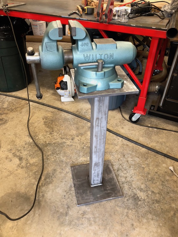 Finally getting around to making a couple of pedestal stands for the two vises I have restored. Wanted to get them off my big welding/table saw out feed table. Always seemed to be in the way. I decided (since I don't have a mag drill and I didn't want to cut some all thread and weld) to use Click Bond 5/8in diameter studs to mount the Wilton 400S swivel vise. Still need to paint the stands and am debating on welding some locking swivel casters to the bottom of the pedestals. The other vise is a late 1930s Rock Island. I think '37 or '38