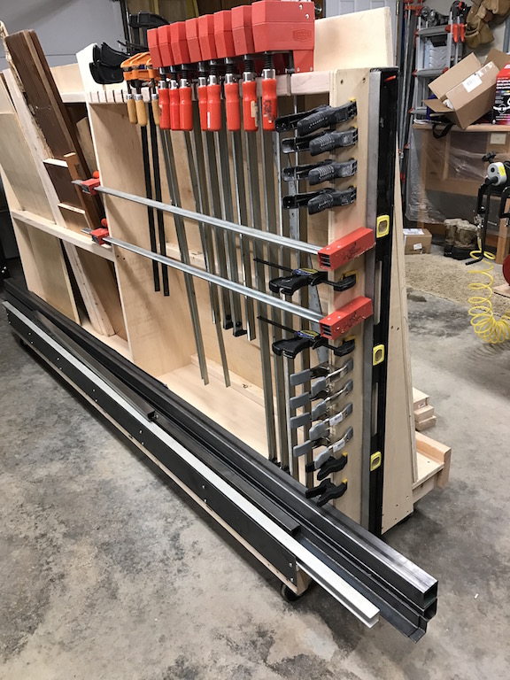 First issue, is that the wheels hang up easy driving over small chips, etc. on the shop floor... I think I got to go much bigger and maybe pneumatic. Second issue is when pivoted toward the back, and the backside of the cart is loaded much more than the front, it is a bit tippy... too much weight too close to the wheels. So, new wheels it will be (8in pneumatic), and spread the footprint. I originally tucked the wheels in such that regardless of position, they wouldn't exceed the envelope of the cart so it would 'nestle' better. Oh well, $40 more for the wheel upgrade and add a rod/dowel holder somewhere. Also now thinking with the higher wheels I just created some decent storage space under the deck for more 'longs'.