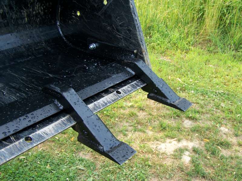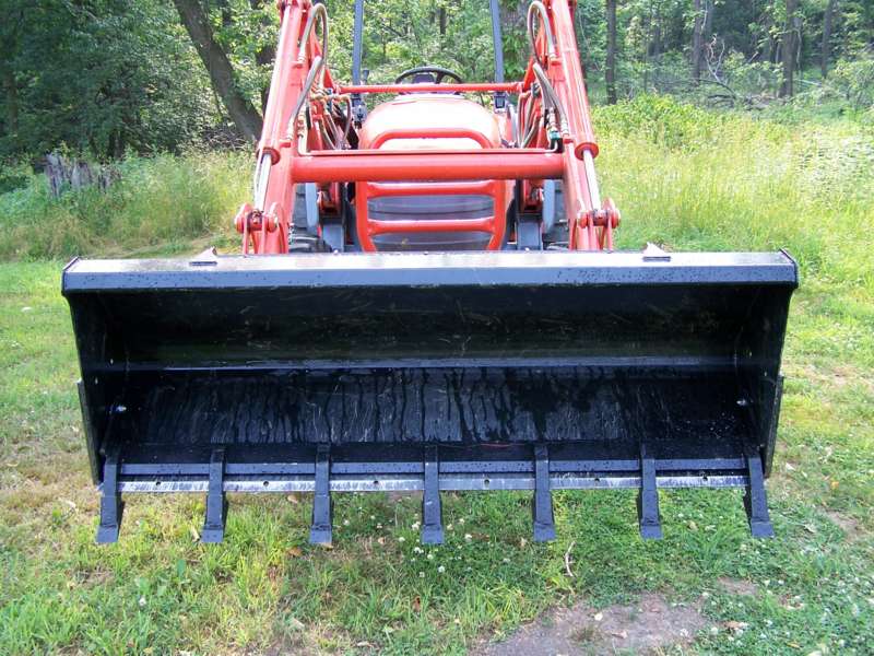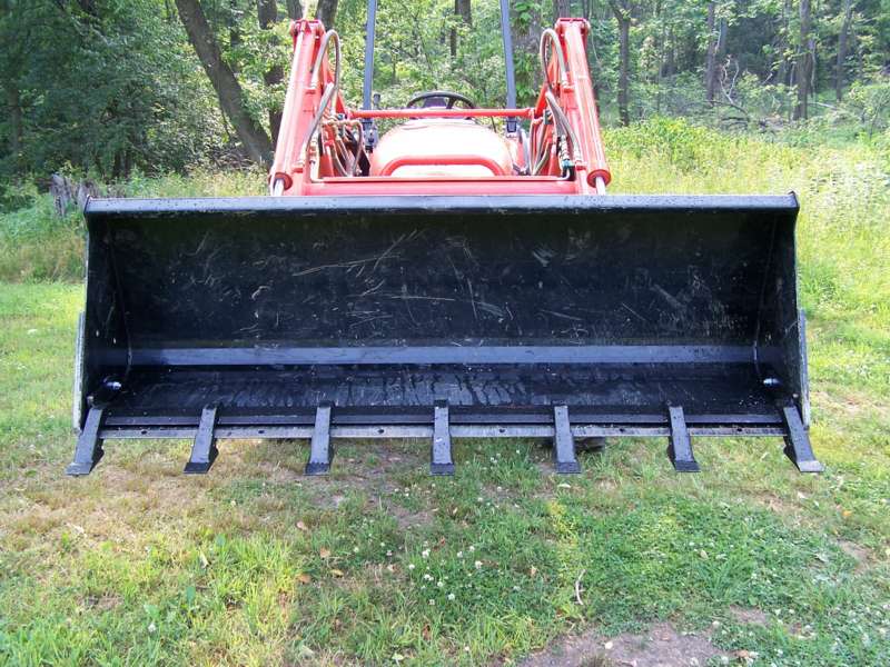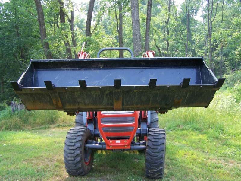 Numerous contractor friends have advised against using the chain hooks for heavy loading as a chain loads only one side of the hook. For that reason, I mounted the outer hooks in line with the loader/bucket frame, not on the outer edges of the bucket.