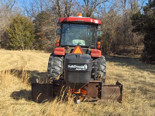 My road is approximately 1/4 mile of gravel and 1/4 mile of blacktop. There is timber on both sides of the road for most of its length and it goes up, down, and around. I plow snow with an L2500DT Kubota and a 7.5' Meyers snowplow mounted to the front frame. I was moving a lot of gravel to the side of the road, so I made a gravel saver out of 2' schedule 80 pipe, which saved the gravel. However, the gravel saver left 1" of snow on the road after each use and is worn half way through after 1 month of use. I removed it after the road was frozen. My problem now is approximately 2.5" of hard packed snow and ice due to traffic and the sun melting the surface during the day and the night time temperatures refreezing it. I picked up 2 yards of 3/4 minus gravel today and spread it with a shovel. At 74 I don't care to do that very often! My question is, has anyone modified a 3-point broadcaster or fabricated something to spread aggregate larger then sand?