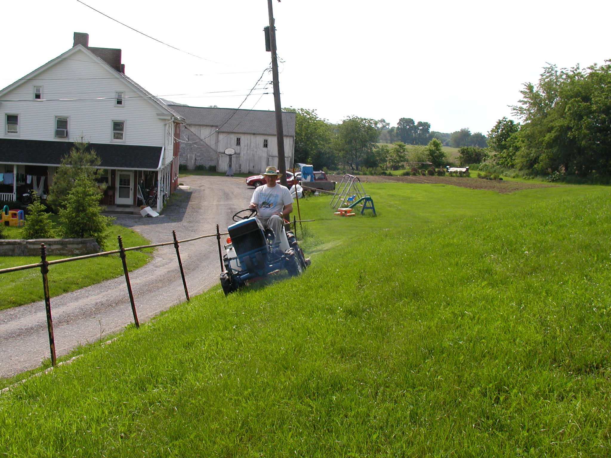When I mowed for my Mom-in-law there was a hill that I really shouldn't have mowed across. As long as the grass was dry it was possible in 4WD. I usually used the old Ford on the hill because I could keep one cheek on the uphill fender and the other on the seat. The RFM doesn't allow any twisting between it and the tractor, so it was pretty stable so far as rollover from the slope itself. Even in good conditions the tractor tended to "crab" along the hill. My one fear was that I'd slide sideways. There was a concrete retaining wall atthe base of the hill that was flush with the ground I was mowing. The ground on the lower side of the wall was about 18" lower and the rusty pipe fence at the bottom would have served no purpose other than to be something to hurt on the way through it. A few times when the grass was damp it did start to slide. I steered sharply uphill and floored it and the tractor got itself pointed uphill.