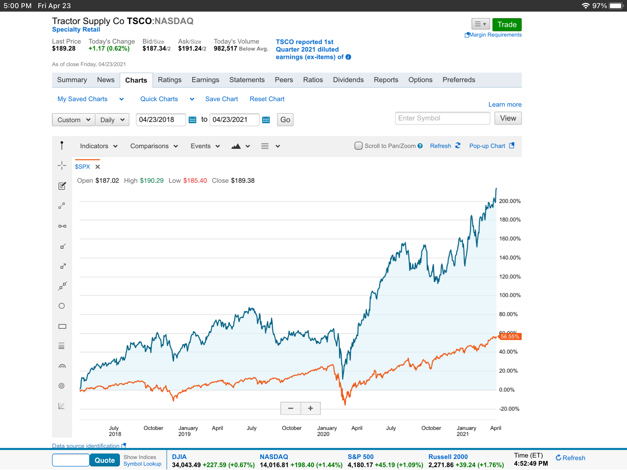 Tractor Supply Co. looks like an interesting case study between what customers think (on TBN) and what investors think. Just for fun, I compared TSCO stock price with the Standard and Poor's 500 over the last 3 years. S&P 500 has been on a tear- up 57% in 3 years. Incredibly, TSCO is up 200% in the same 3 years!