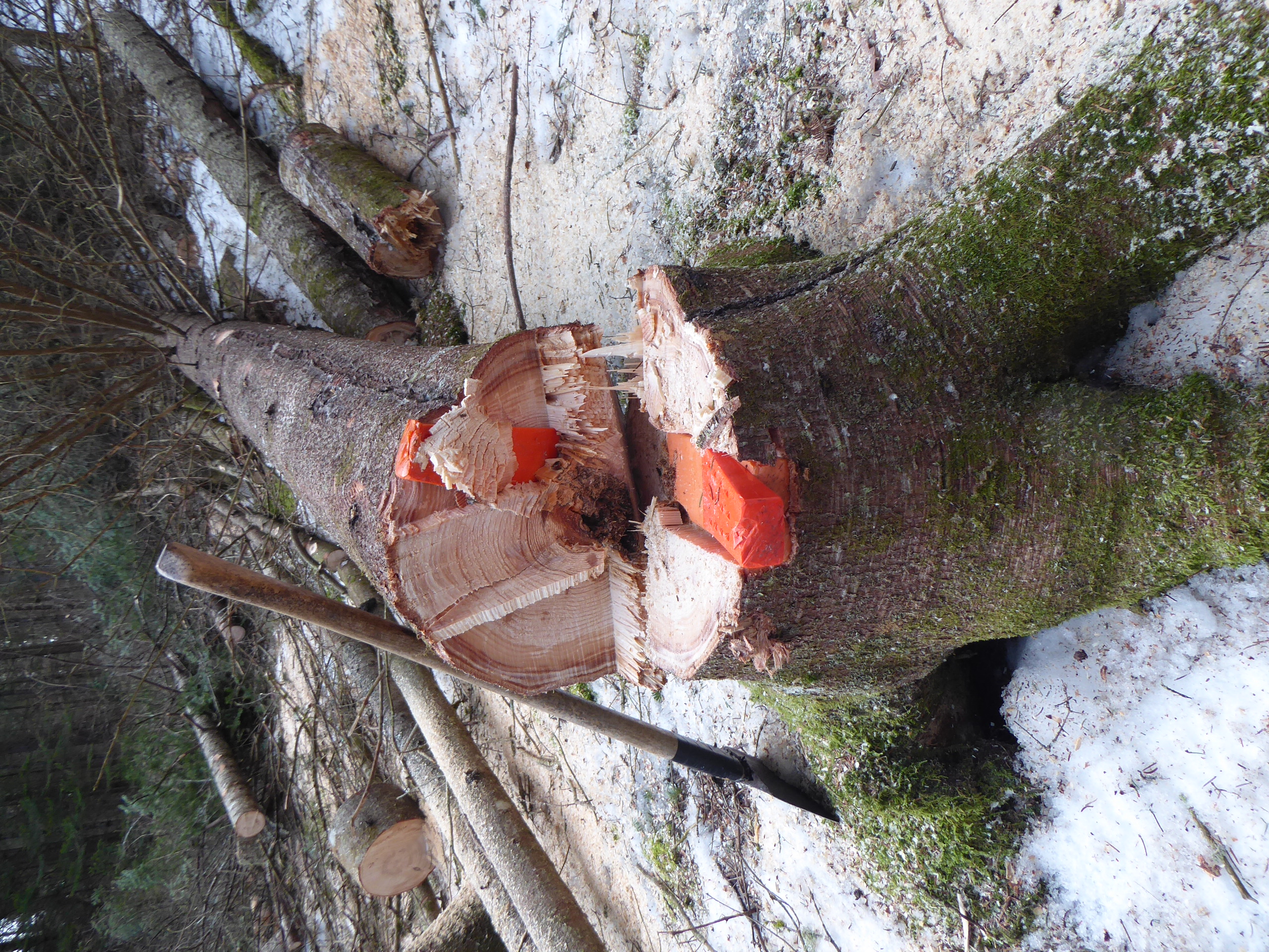Long wedges work better in the winter because they have a shallower taper. Short fast tapered wedges are prone to squirting out on you when the wood is frozen and icy. But a long wedge might bottom out on the hinge before it is fully set. So you bore a slot thru the center of the hinge as a passage for the wedge. Or if the tree has to small a diameter to get a wedge in after the back cut is started then you can put the wedge in before starting the back cut with this method.