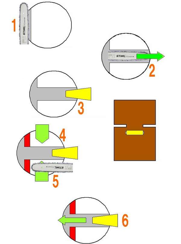Cut out the notch. Lay or hold the saw on the flat of the notch and bore straight back and out the back of the tree. Set the wedge in the back slot. Then make a back cut on each side of the tree slightly over lapping and above the bore cut. Drive in the wedge to tip the tree over. The small sections of vertical grain above the bore cut split very easily.