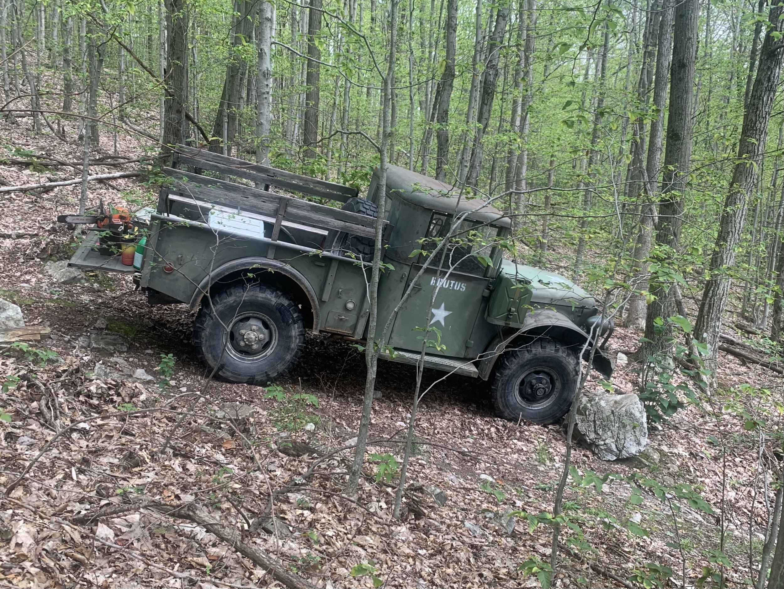 I've posted on here before about Brutus, my 1951 Dodge M37, a Korean War Military pickup truck. I got it for it's great ground clearance and rugged build. It's not fast (way under-powered by today's standards), but it will go anywhere and has a lot of "character". I think of it as my "fast tractor" rather than a slow truck. I regularly use him in the woods getting firewood, and have set him up for towing my log forwarding trailer. I always get compliments and questions when driving him around town.