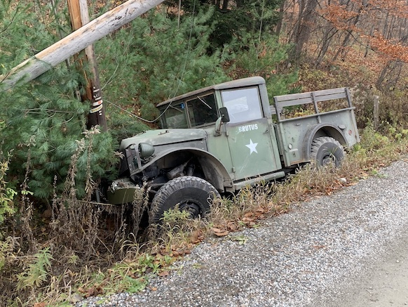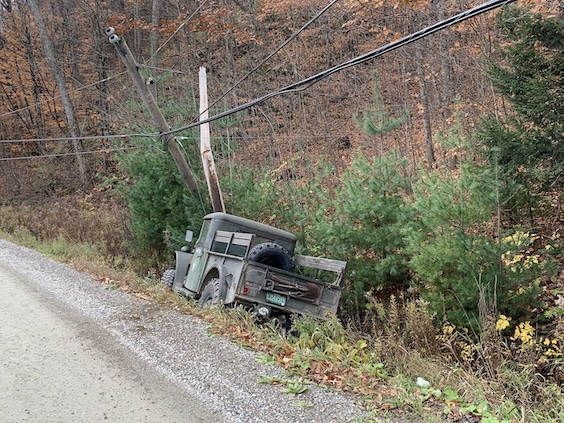 I was driving down a small dirt road, slowed way down to go around a 90˚ bend. As I came out of the curve, another truck was coming around a small bend from the other direction, driving almost down the middle of the road. I pulled over as far as I could, but he barely moved over at all. I pulled over a few inches further, and my right wheels dropped off onto the soft shoulder of a deep ditch. I rode the edge for a bit, I tried to turn back on to the road, but it was not use. I was afraid to turn the wheels too far out of concern for rolling the truck into the ditch. Even hard braking was chancy, since it seemed to shift the weight toward a roll. Most of these trucks had a soft top (canvas). The hard top on mine is not structural. It would have collapsed like a tin can if I had rolled. I ended up just riding it out for about 200 feet. I tried to miss the pole, but the ditch held me right on that track.