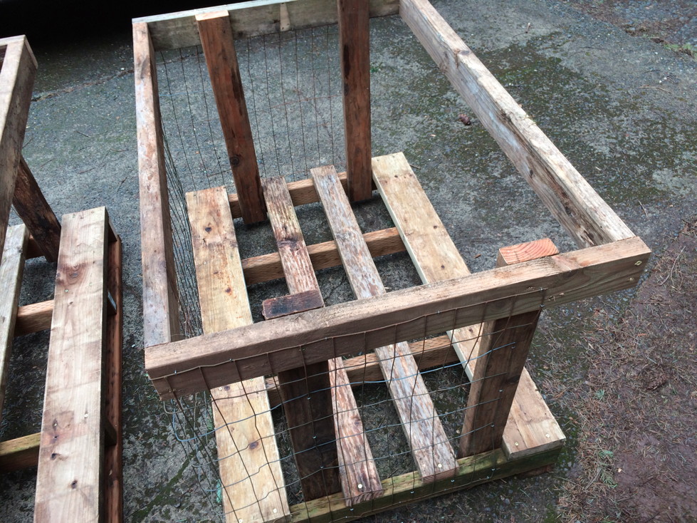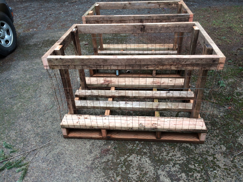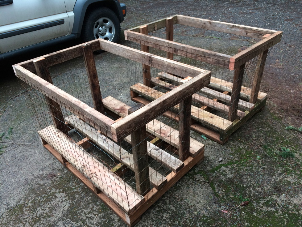 Made from scrap 2x4 and 2x6 boards, and old fence wire, except two new treated 2x4's for the ground contact. 48 wide, 32 deep, and 25 inside height. Holds about the same as four loads of wood in the bucket.